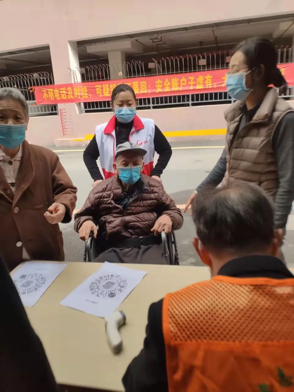 社工协助维持现场秩序,为居民测温。