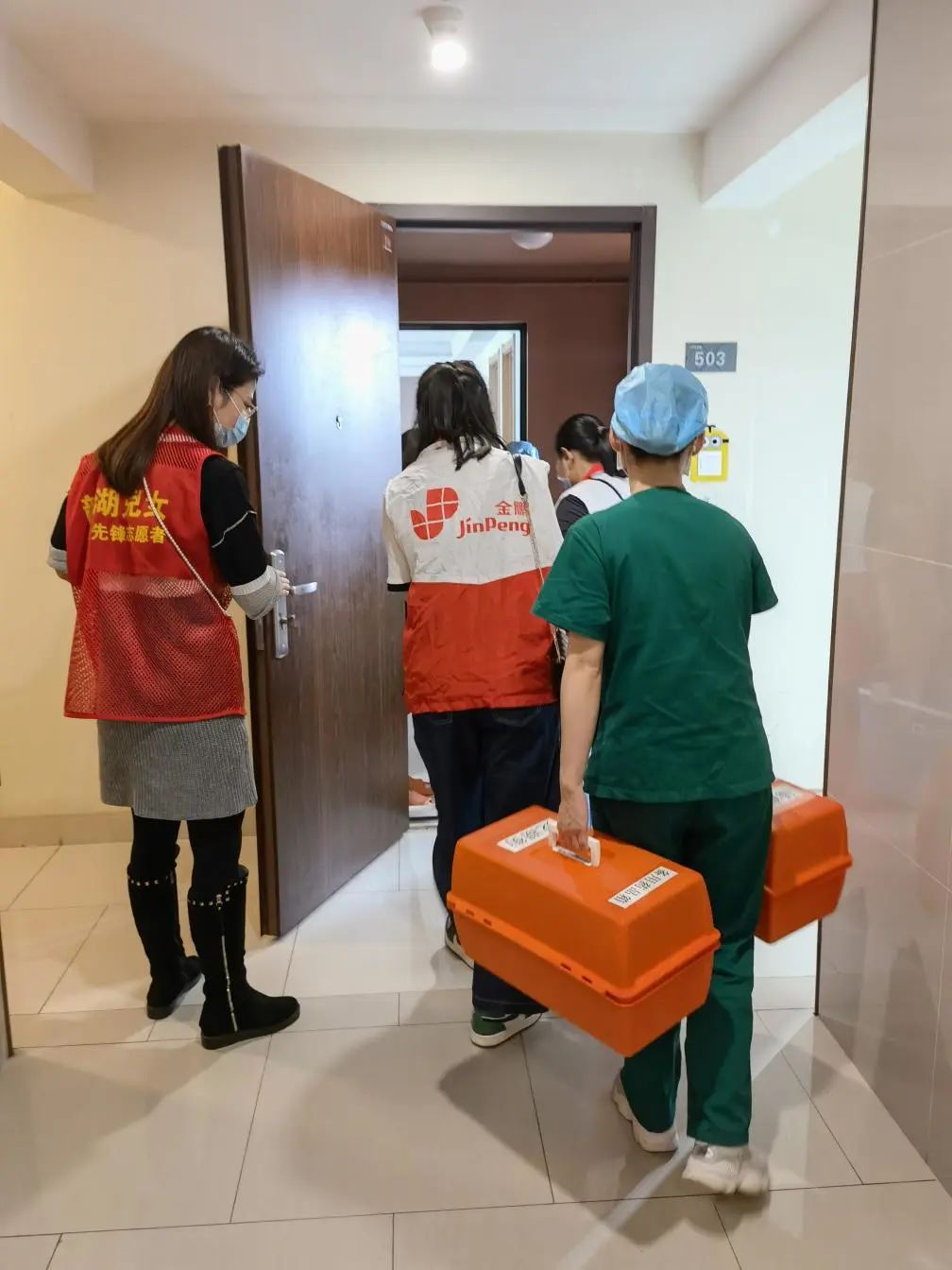 社工协助医生上门“送苗”,为行动不便的长者接种疫苗。