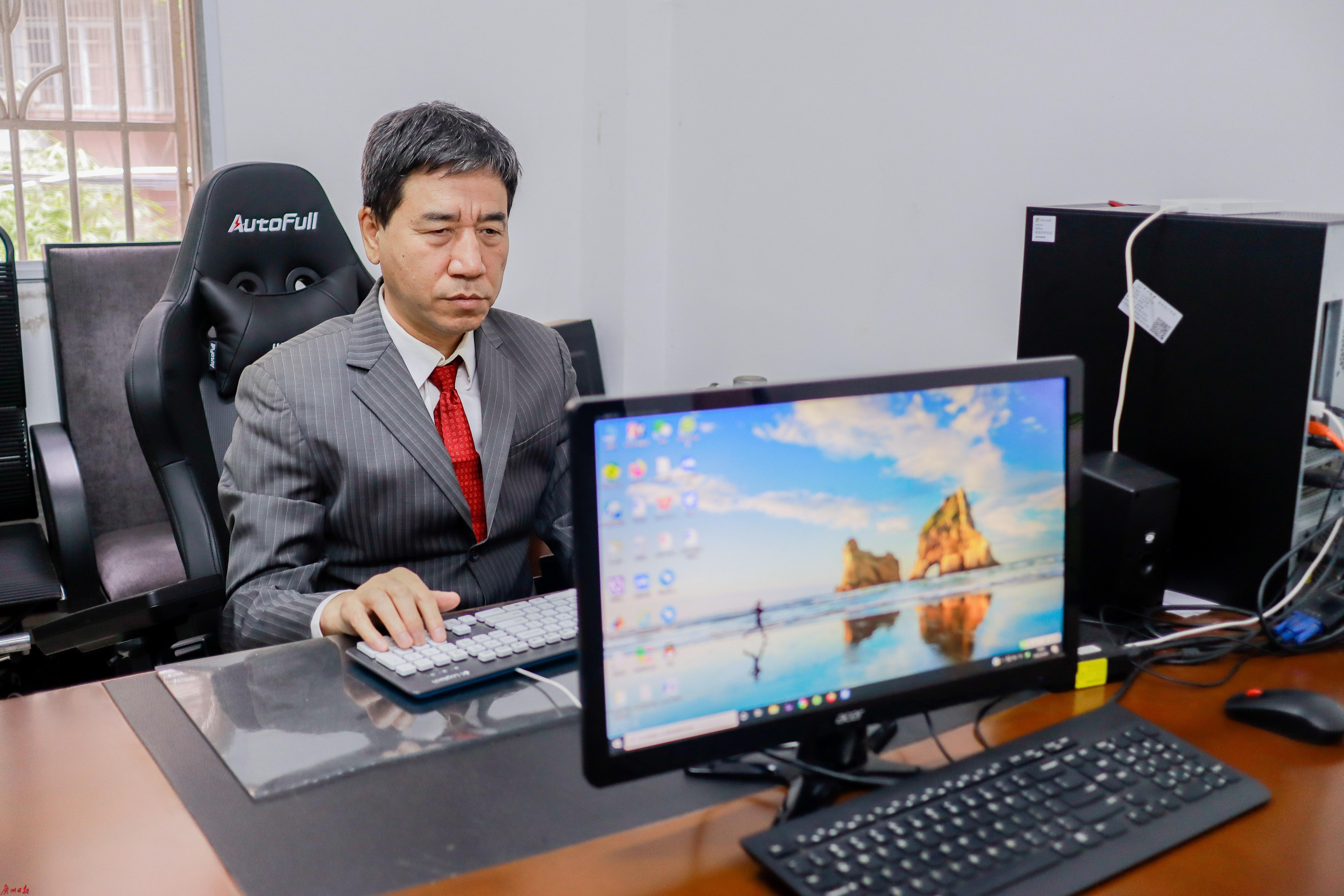 富明慧在电脑前工作,他的屏幕是对着自己的学生。