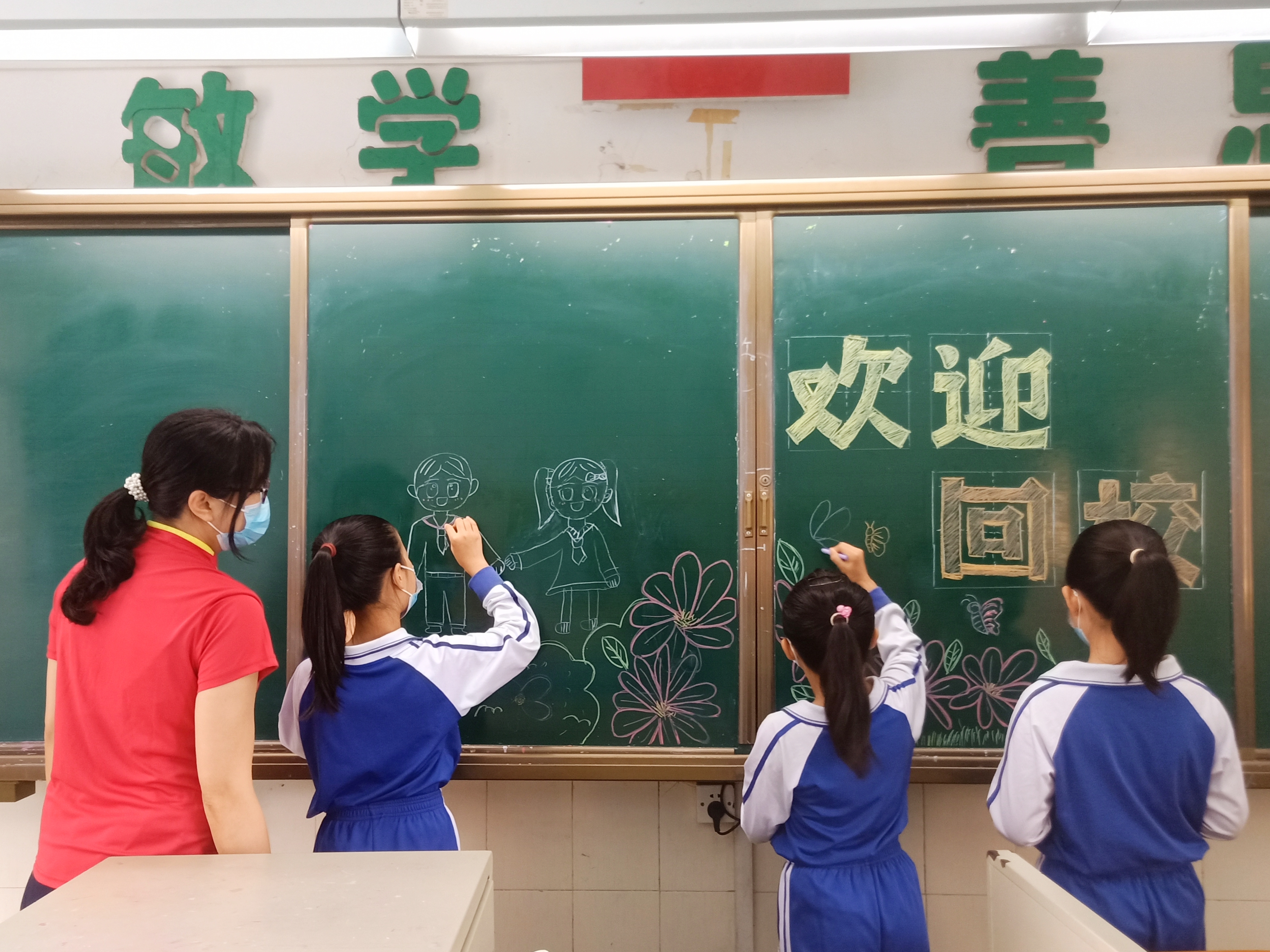 与此同时,其他老师在教室里,进行班容班貌的布置和教室清洁工作,一些同学也自愿报名回到学校,协助老师们。“能回校做力所能及的事我很开心。”来自五年级的黄同学和二年级的罗同学表示,一听到回学校协助打扫和布置的消息,她和同学们就立马报名。谈到明天的复课,三年级的小志愿者杨同学表示十分期待。线下的学习生活意味着她能和想念的老师、同学们重聚一堂,也更利于她向老师咨询学习上的疑问。