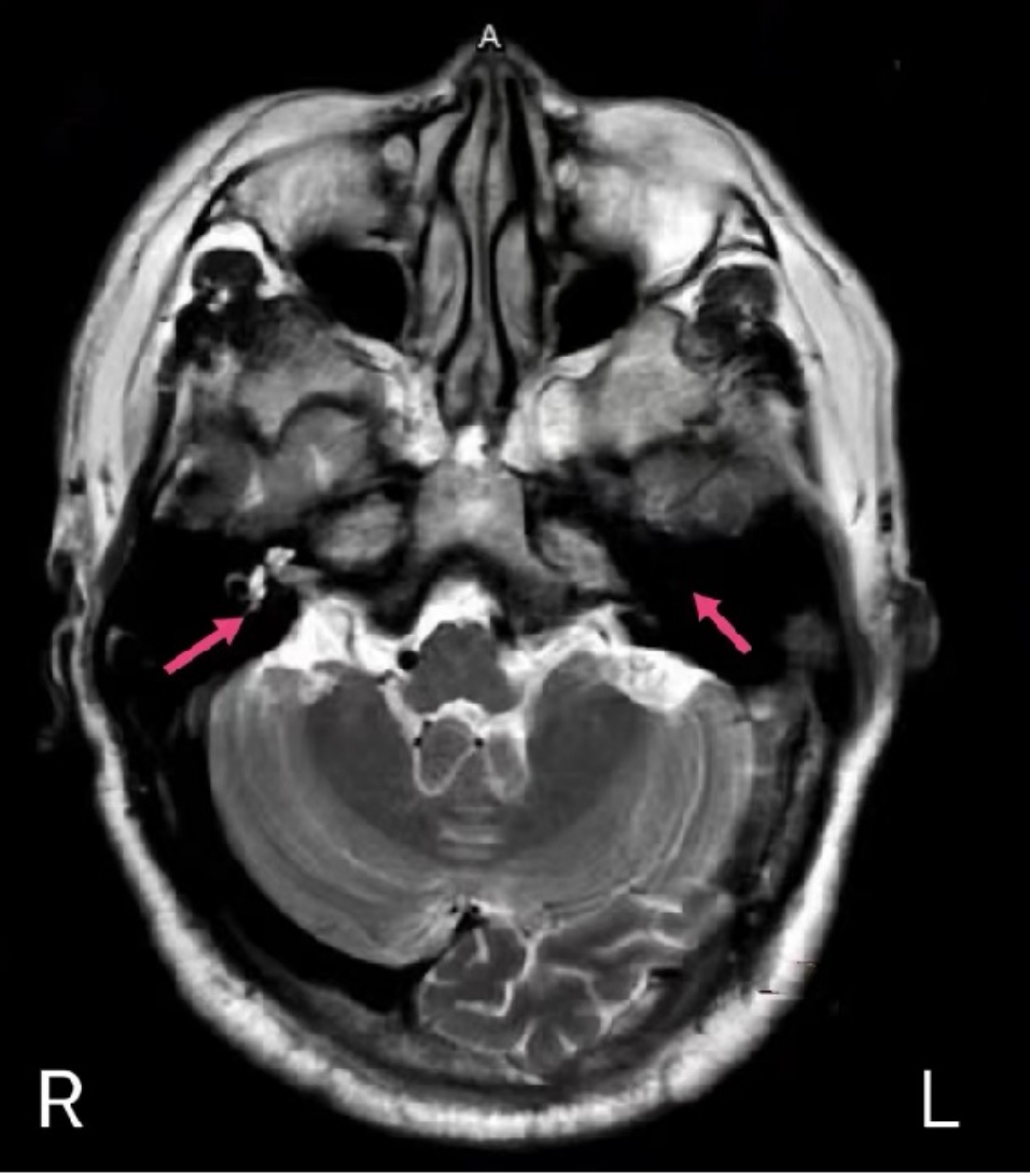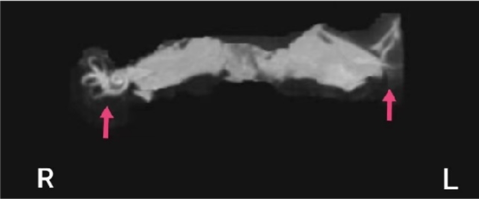 磁共振显示左耳内耳结构消失,红色箭头所示