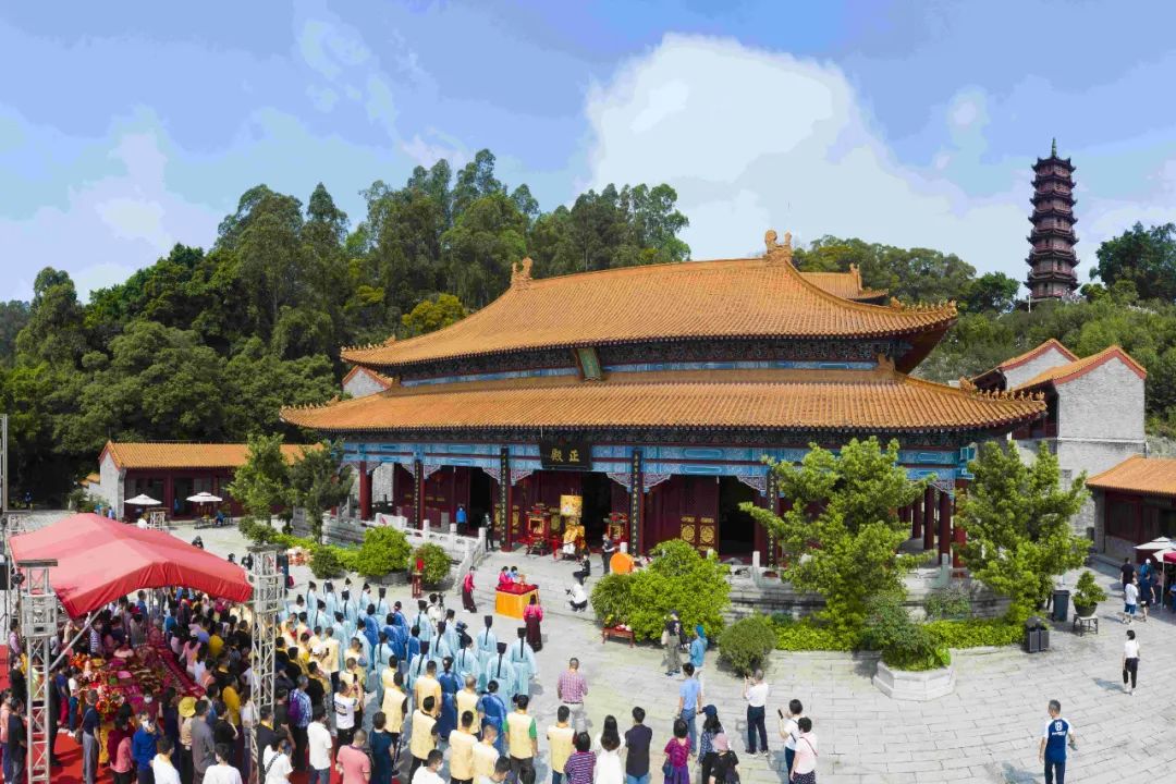 南沙天后宫正殿前,妈祖文化敬仰者身穿传统礼服参加三献礼仪式,钟鼓齐鸣,依照古礼,读祝文,行三礼。南沙妈祖信俗于2013年荣获广东省非物质文化遗产,三献礼则是汉人历来有的一种礼节,属于首批国家级非物质文化遗产项目。