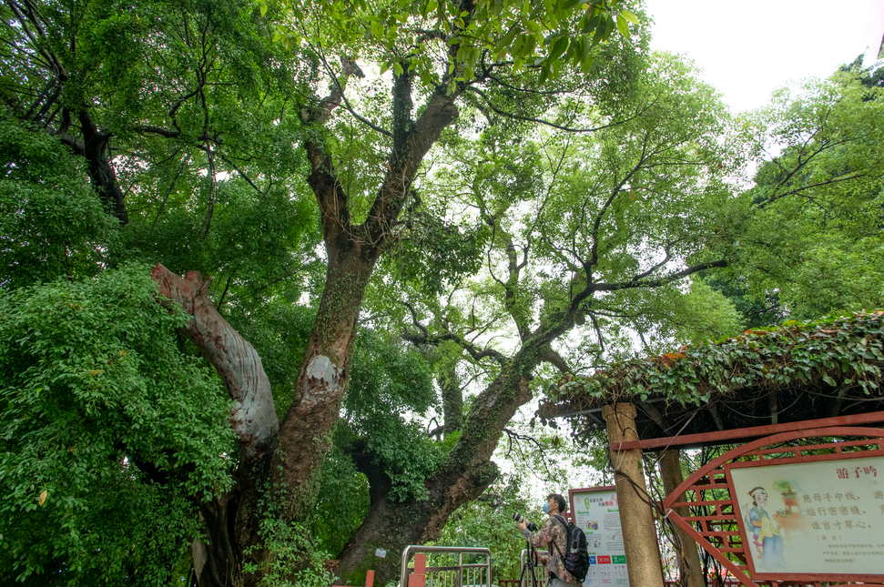 绿树浓荫,耸入云天。站在黄埔区火村老樟树底下,只觉清风阵阵,清香扑鼻。这棵900多岁高龄的樟树被列为广东省一级保护的古树名木,是广州冠幅最大、最老的樟树,与一旁的细叶榕同根同生,被当地村民称为“千年孖生树”。72年前,火村小学环绕“孖生树”而建,学生围着古树乘凉嬉戏,几乎每个村民的记忆深处都离不开“孖生树”。正如村民钟伟波说,“‘孖生树’依旧茂盛,一直守护着脚下的村庄,世代繁衍,繁荣发展。”