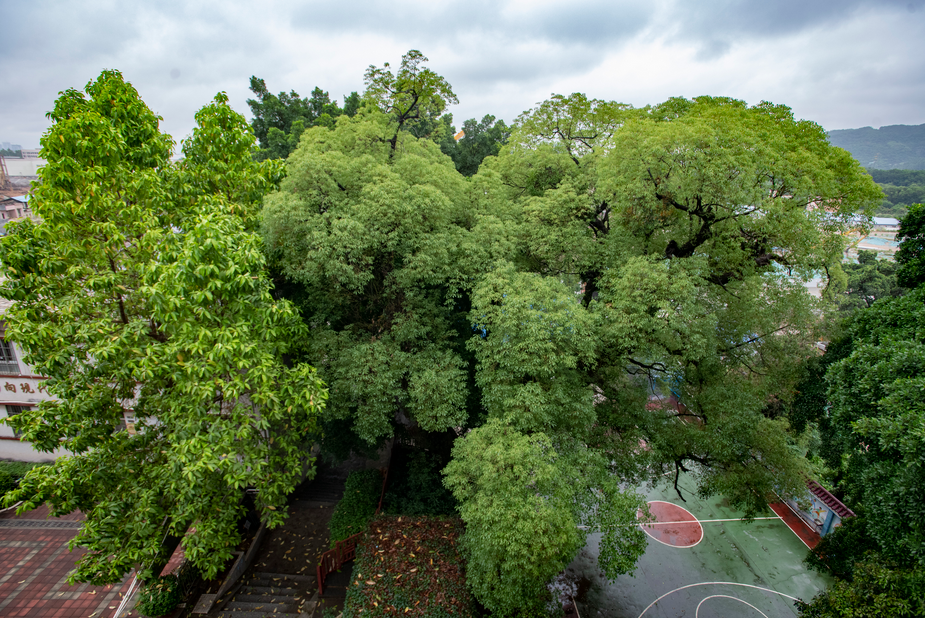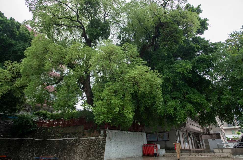 古树见证了岁月变迁,孩童走过天真时光,长大成人,但“孖生树”依旧苍翠,树冠还是那么大,树皮上自然开裂的纹理苍劲有力,写满了岁月的痕迹。“树冠很大,如同一把大伞,夏天时,树下清爽宜人。下雨时,树下又能遮风挡雨,即使有过云雨突袭,几十个学生挤在树底下,都不怕淋湿。”钟伟波回忆。后来,古树还逐渐成为鸟类的“家”,小鸟在树上筑巢栖息、繁衍后代。古树对面便是老师的办公室,每到清晨,清脆悦耳的鸟鸣声从树冠深处传来,为老师们的工作增添了一丝惬意。