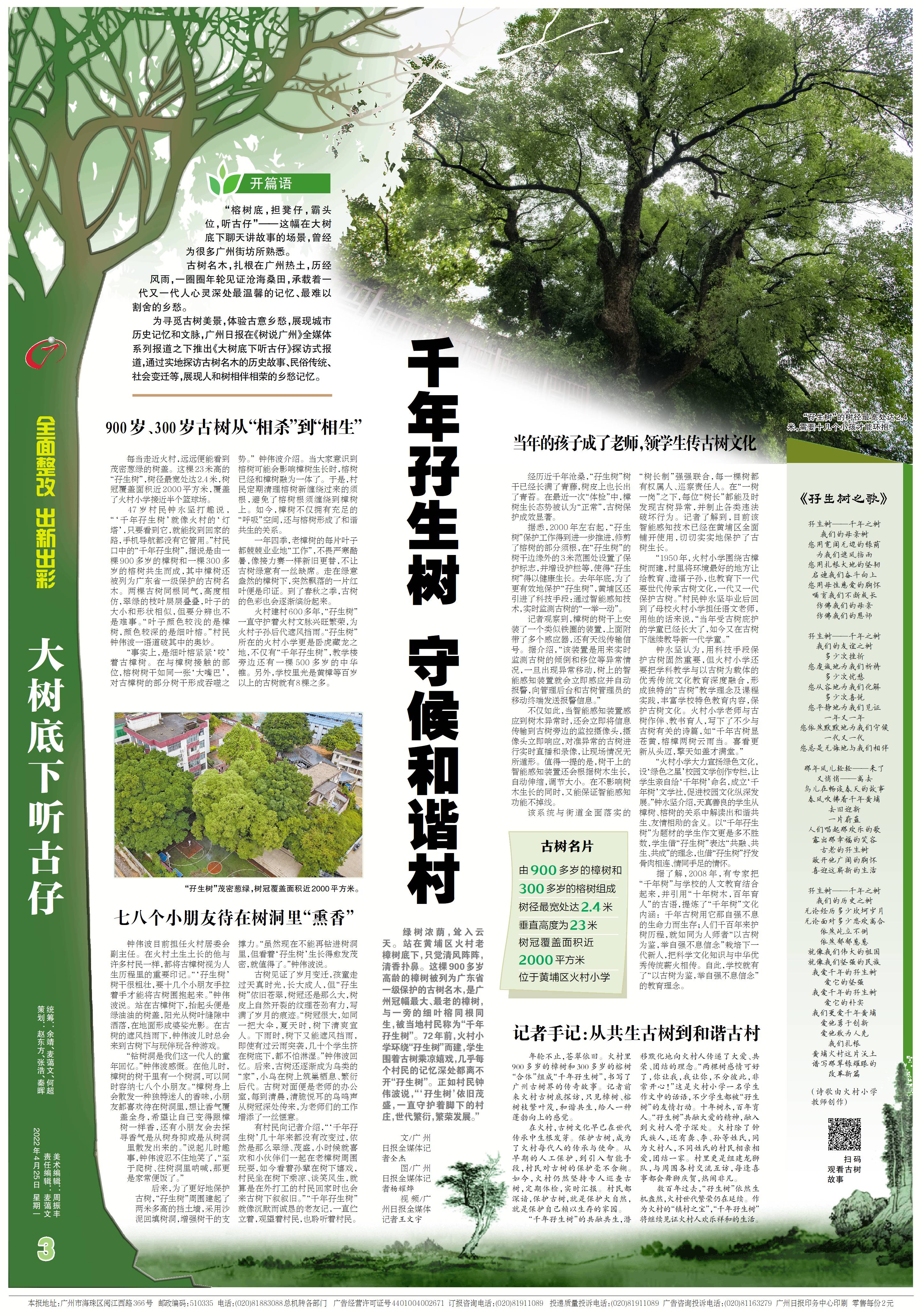 古树名木,扎根在广州热土,历经风雨,一圈圈年轮见证沧海桑田,承载着一代又一代人心灵深处最温馨的记忆、最难以割舍的乡愁。为寻觅古树美景,体验古意乡愁,展现城市历史记忆和文脉,广州日报在《树说广州》全媒体系列报道之下推出《大树底下听古仔》探访式报道,通过实地探访古树名木的历史故事、民俗传统、社会变迁等,展现人和树相伴相荣的乡愁记忆。