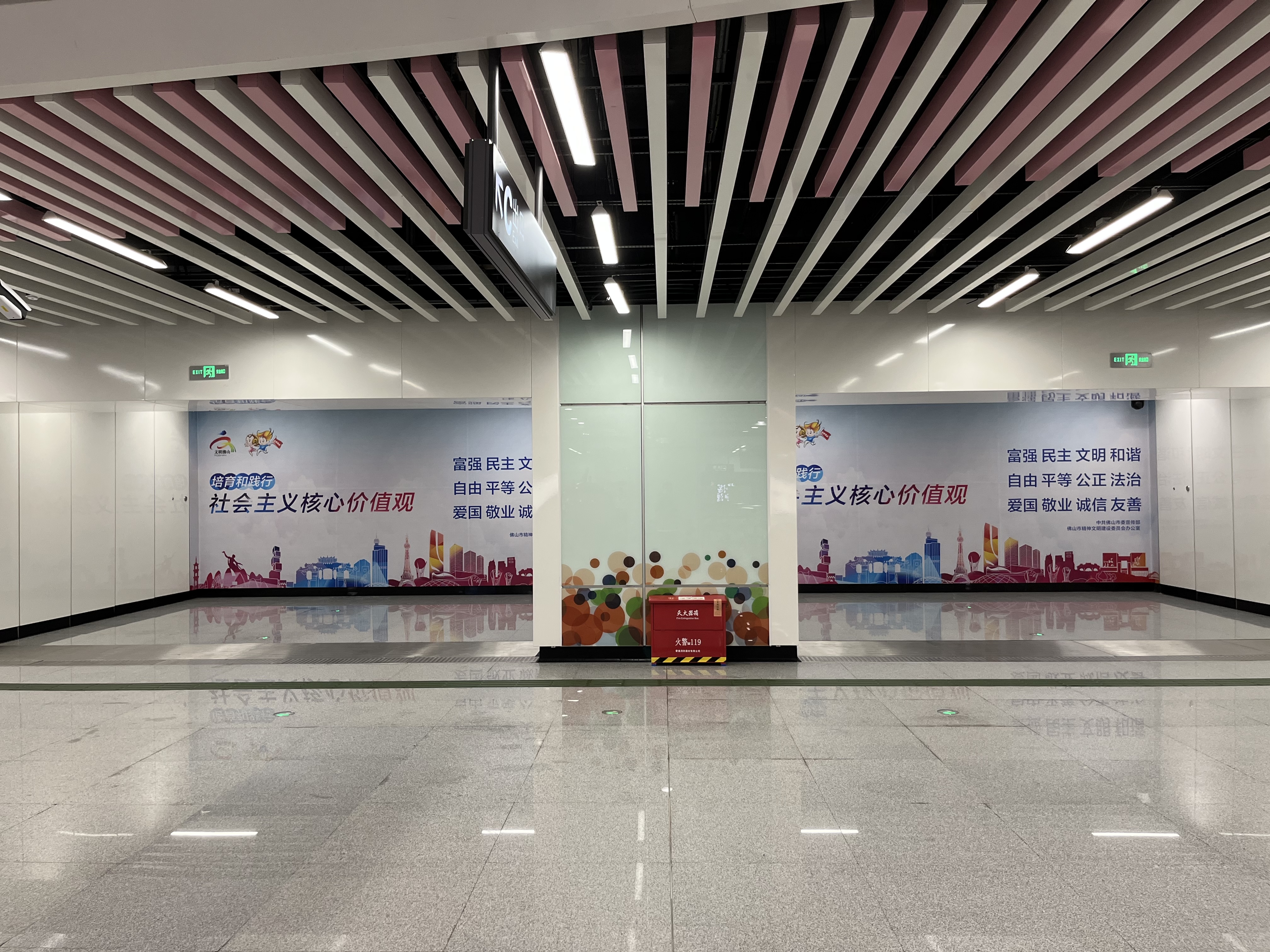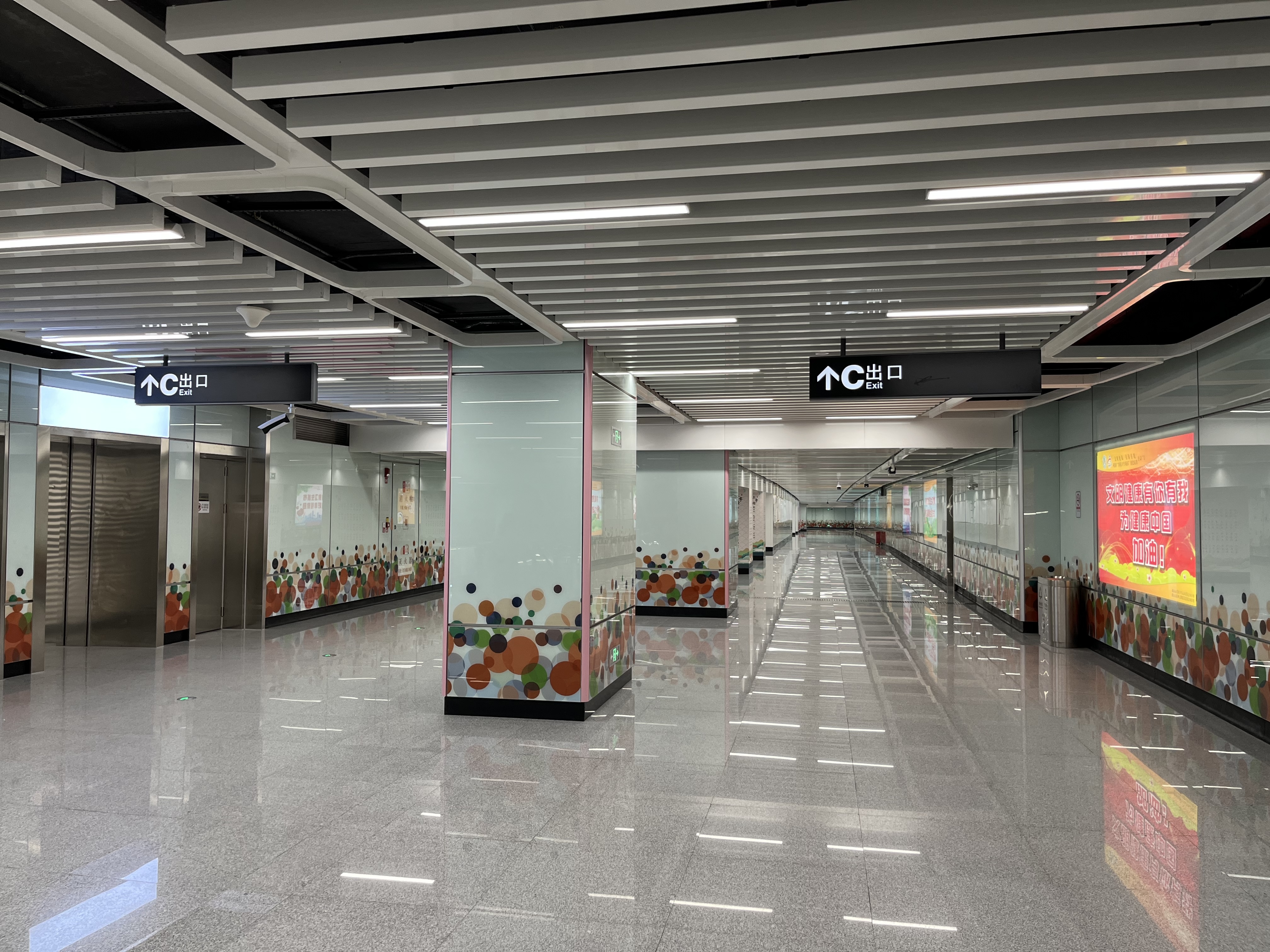 在换乘广佛环线的陈村站,站厅层东侧的区域大部分被挡板围起,这些都是通往城际车站的接口。记者留意到,站厅到C口要走一段长达数十米的通道,该通道高于站厅层,彼此以扶梯连接。车站工作人员介绍,通道下方就是计划今年开通的城际广佛南环。