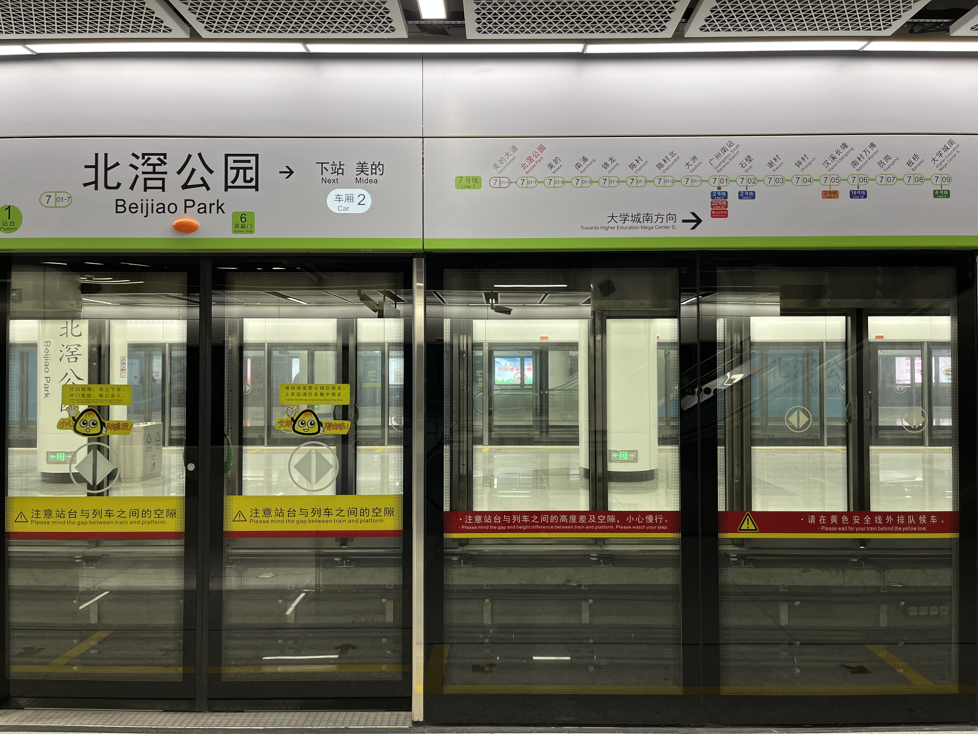 记者在换乘佛山三号线的北滘公园站看到,车站共有三个站台。其中两个是同向同台换乘设计,七号线站台对面就是未来的佛山三号线,最大限度缩短乘客的步行距离。另一个站台为反向换乘设计,方便搭七号线广州方向列车的乘客反向换乘佛山三号线。