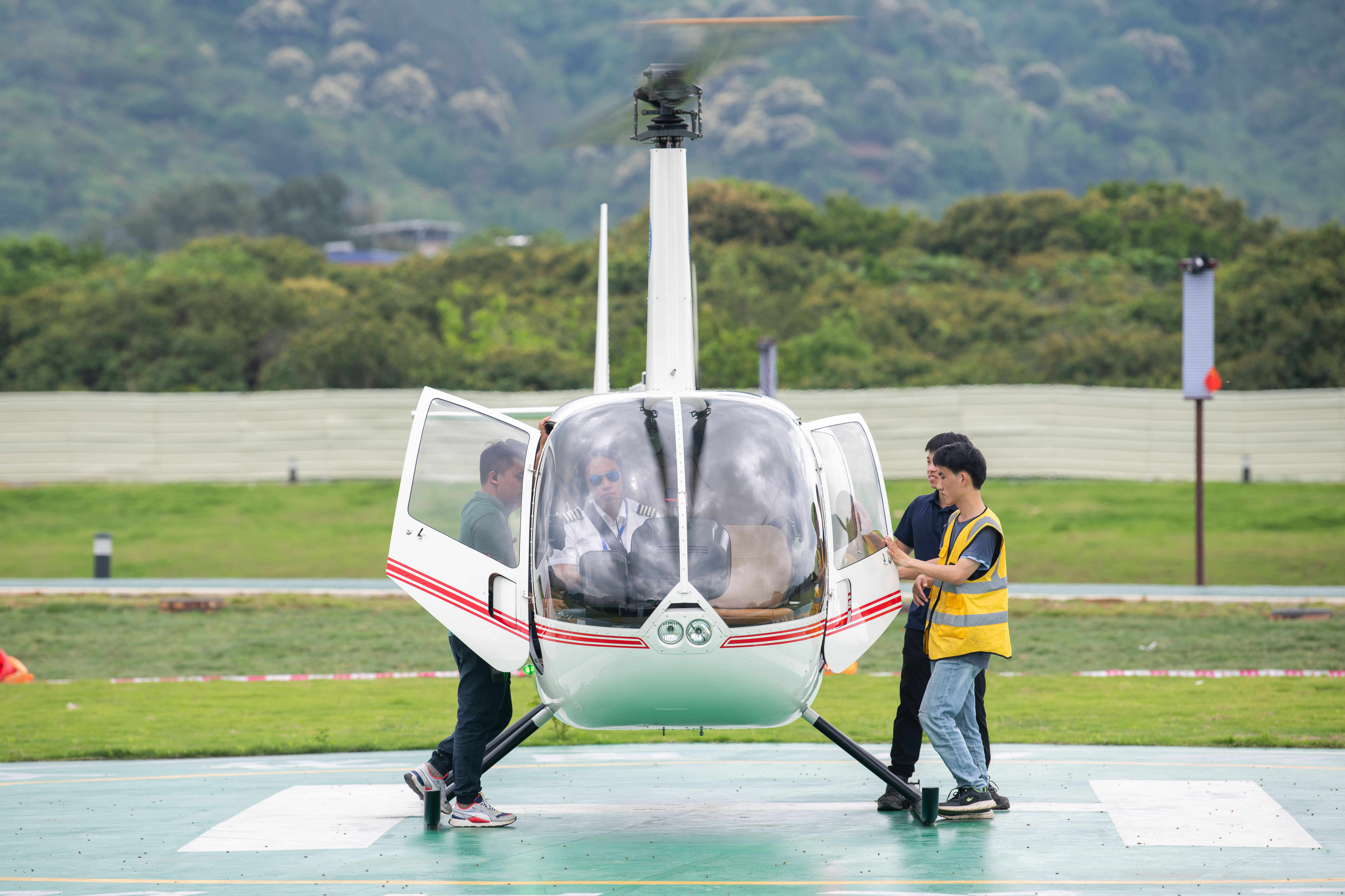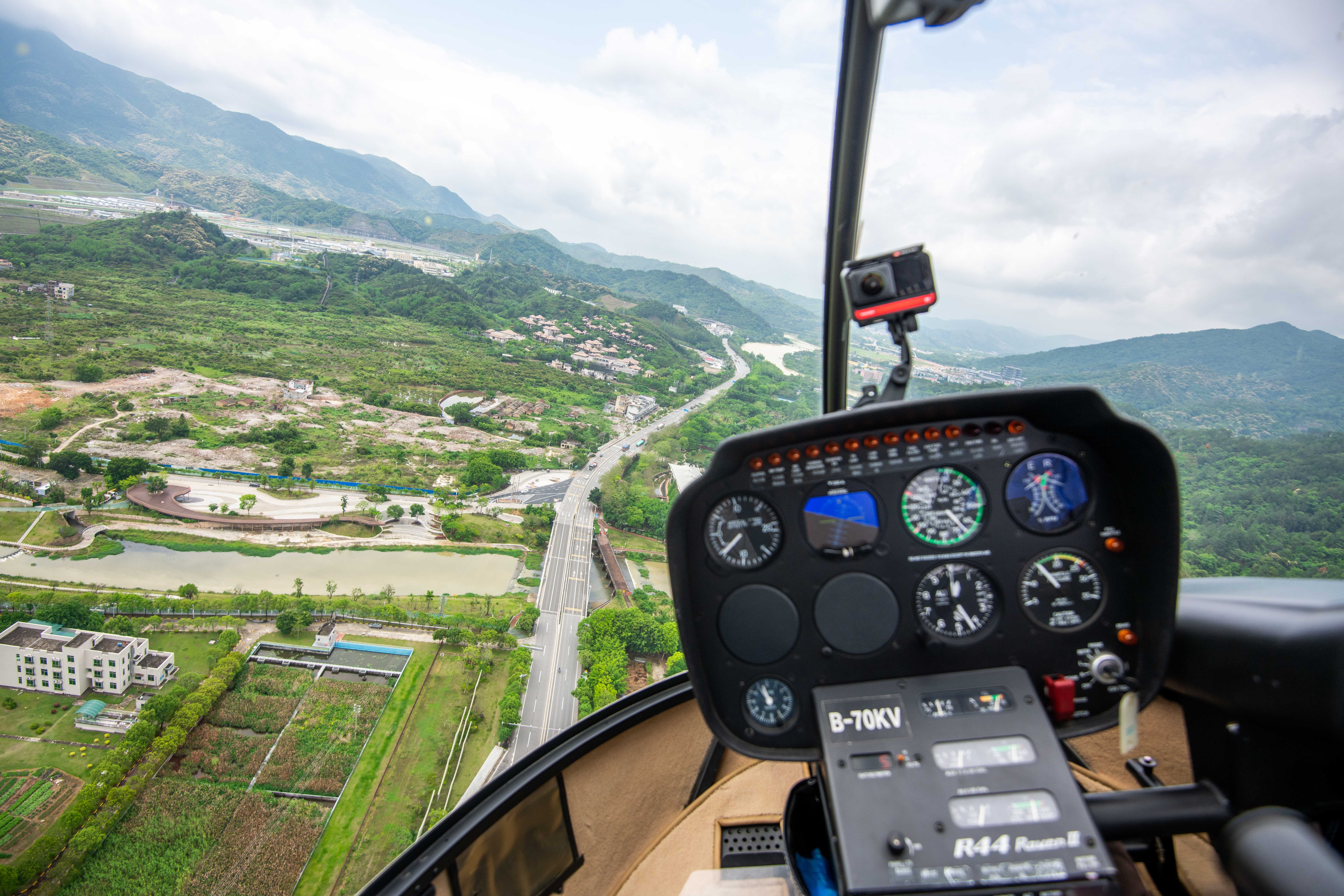 波光粼粼的鸭洞河、郁郁葱葱的山脉、绿油油的大草坪、整齐划一的乡村民房……乘着直升机,在1000英尺(即304.8米)的半空中,将整个从化生态设计小镇的青山绿水尽收眼底。4月24日,来到从化生态设计小镇良口机场体验了直升飞机低空游的黄小姐直呼“过瘾”。