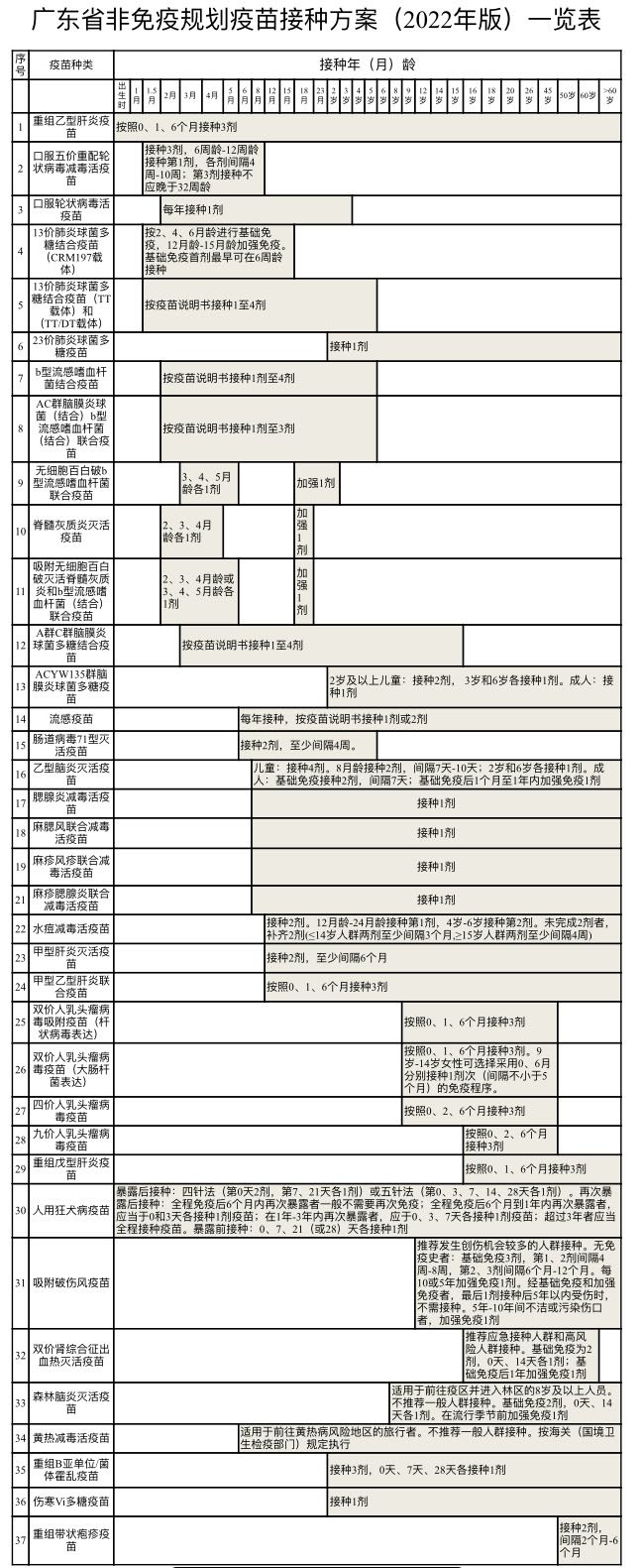 广东省非免疫规划疫苗接种方案(2022年版)一览表