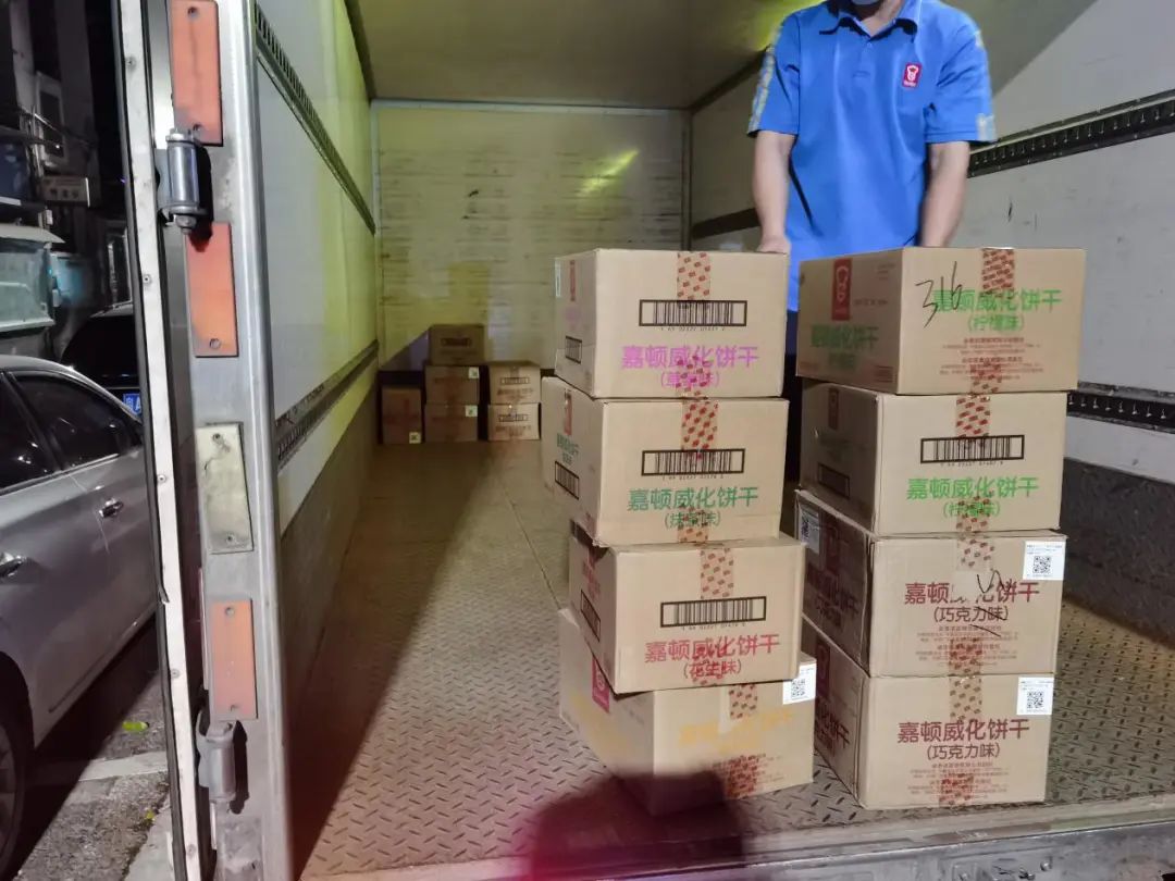 爱心企业连夜协调车辆运送饼干、蛋糕等干粮到核酸检测点位。