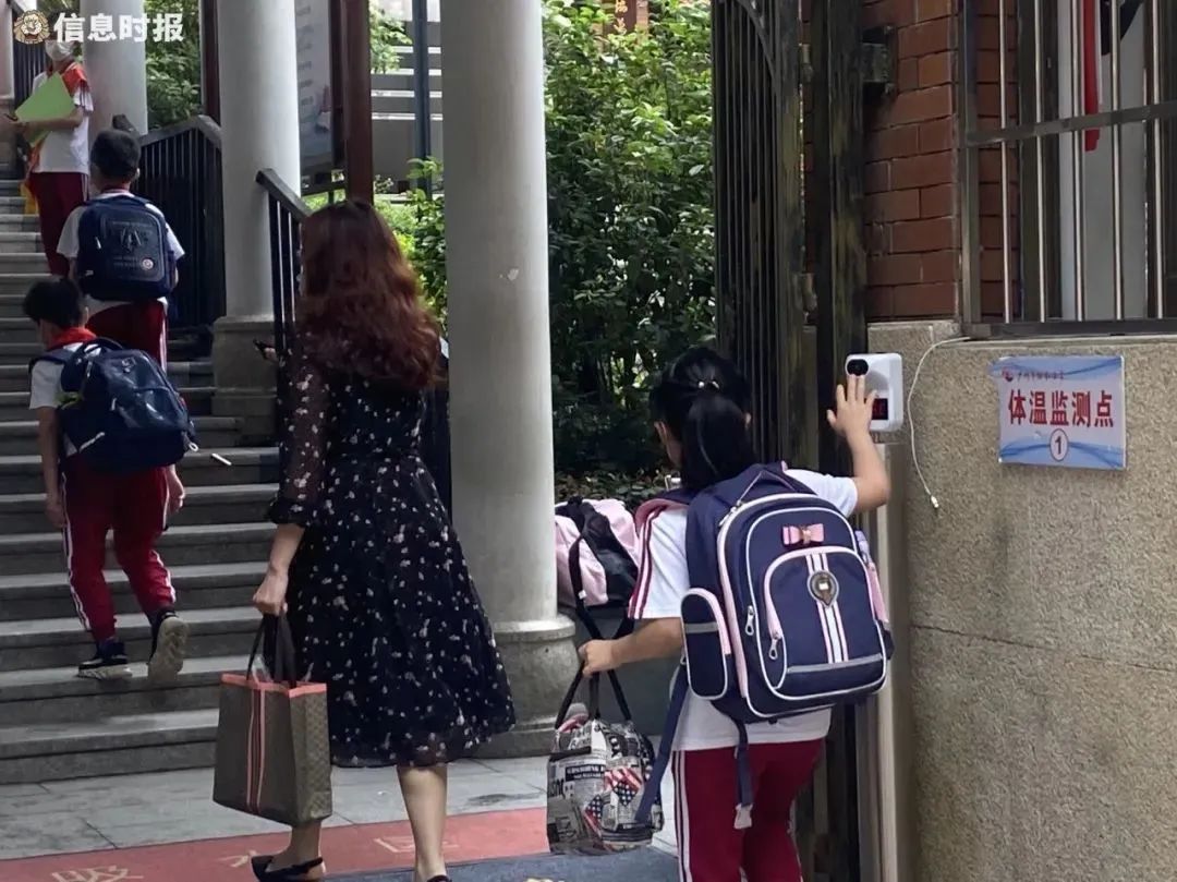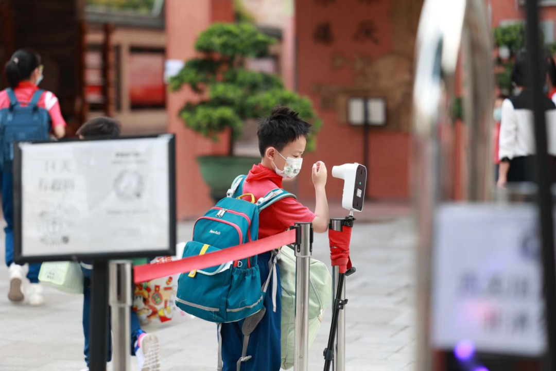 “好久没见了,你长胖了!”一名小女生跟另一位孩子调皮地说道。孩子们逐一检测完体温,跟校门前的老师们问好,开心地踏入校园。