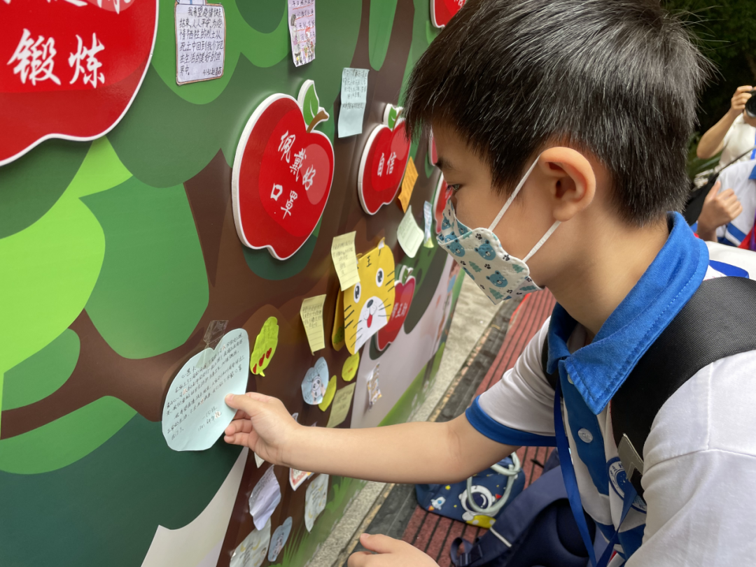 清晨回校,学生们纷纷将自己的心愿贴张贴在校门口的“生命树”。一张张心愿贴,寄托了学生们对返校上课的满满期待,总结了居家学习锻炼的收获。学生们回到熟悉的课室里,兴高采烈地贴上给同伴的温馨防疫提示,想对同学说的话。重回校园,相聚课堂,孩子们再次感受到了集体的温暖。
