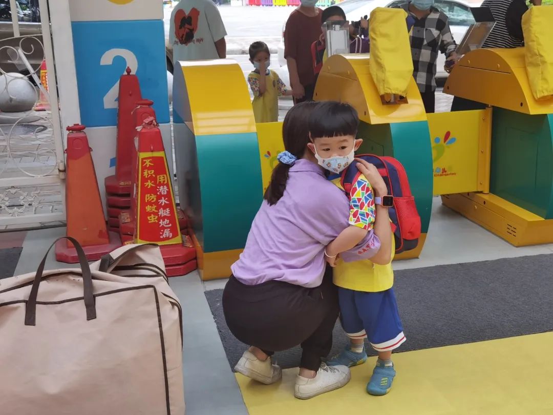 开学啦,桥南可逸江畔幼儿园的老师和返校的小朋友来了个大大的拥抱。
