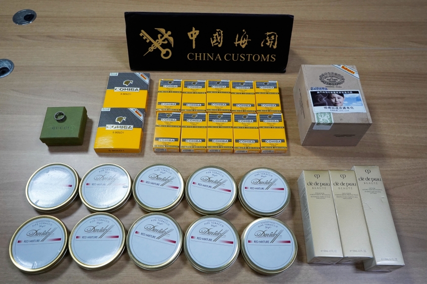 4月22日18时许,海关关员在港珠澳大桥珠海公路口岸进境客车道巡查时,发现某粤澳两地牌客车存在异常,后经顶照式查验设备扫描显示多处异常。关员对该车进一步查验,将主驾驶的脚垫掀开后,发现脚垫下方藏匿有两盒烟丝,又在该车后备厢杂物桶、三扇车门储物格、副驾驶位后纸巾盒等位置发现有未经申报的“JOSE GENER”“COHIBA”牌雪茄烟13盒共计85支、“Davidoff”牌烟丝10盒、护肤品3支及 “GUCCI”牌戒指1个。