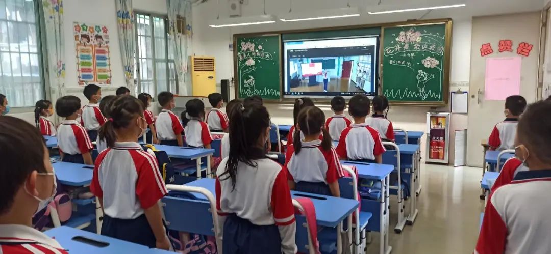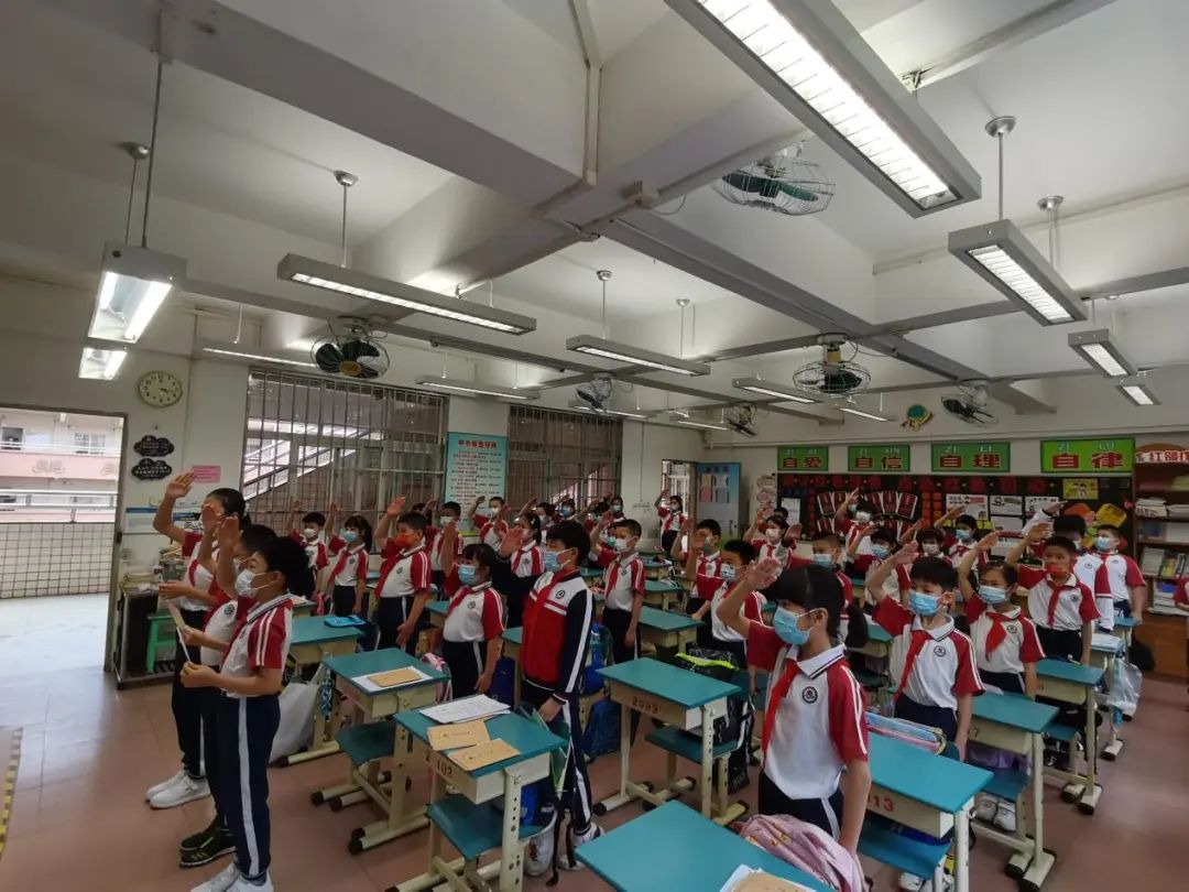 校园重聚,但疫情防控不能松懈,珠光路小学举行了一场简单而隆重的升旗仪式。在操场上,大队委代表全校的少先队员参加了线下的升旗仪式;在课室里,全校师生参与了线上升旗仪式,少先队员面向国旗,庄严地行注目礼。