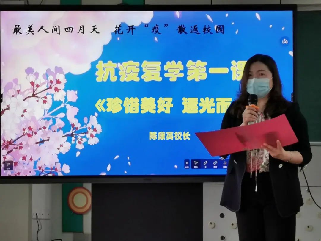 升旗仪式过后,珠光路小学校长陈康英为同学们带来温馨暖心的复学第一课:《珍惜美好 逐光而行》。“我们感恩所有医护人员、街道社区工作人员、警察叔叔……他们日夜辛劳坚守岗位,守护我们的城市家园。”陈康英在课堂中提到:今天的返校复学来之不易,她鼓励学生要学会感恩,珍惜这份美好。