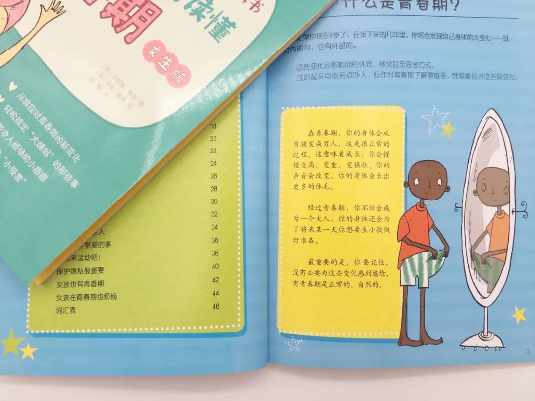 书中内容很多,也很详细,几乎包含了青春期的方方面面。身体变化,情绪变化,情感和人际关系,健康生活方式,异性的青春期烦恼……那是应有尽有,简直可以说是青春期成长“说明书”,每本书22个小节,外加一个词汇表,内容丰富。