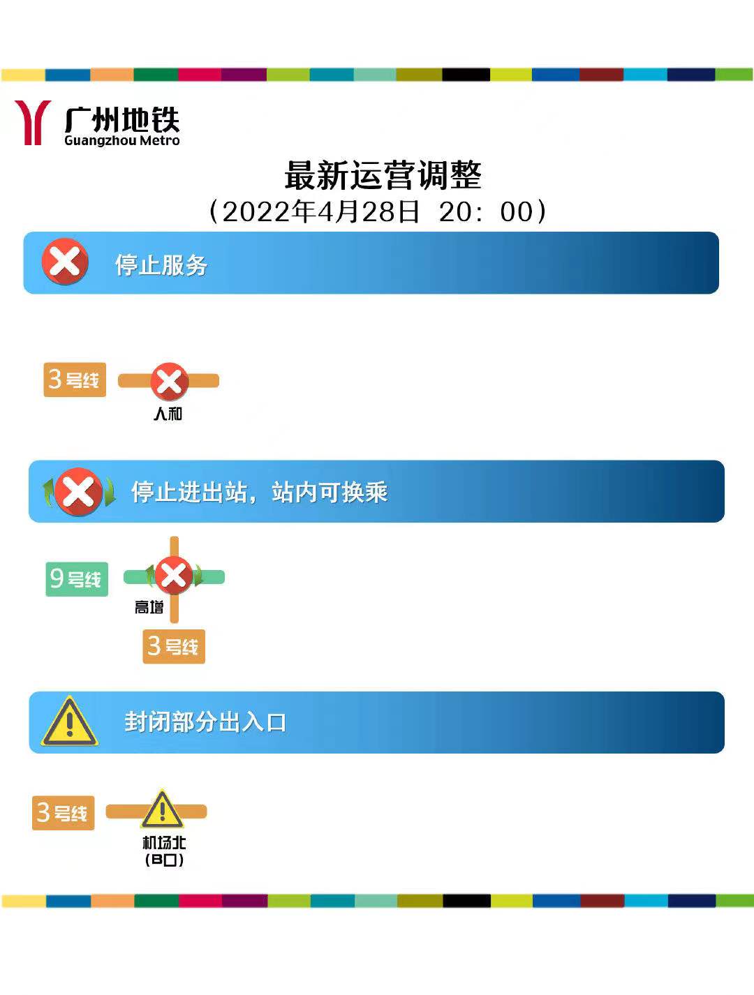 截至28日20时,广州地铁三号线人和站停止对外服务,列车不停站运行;三号线及九号线高增站停止进出站服务,仅保留站内换乘功能。