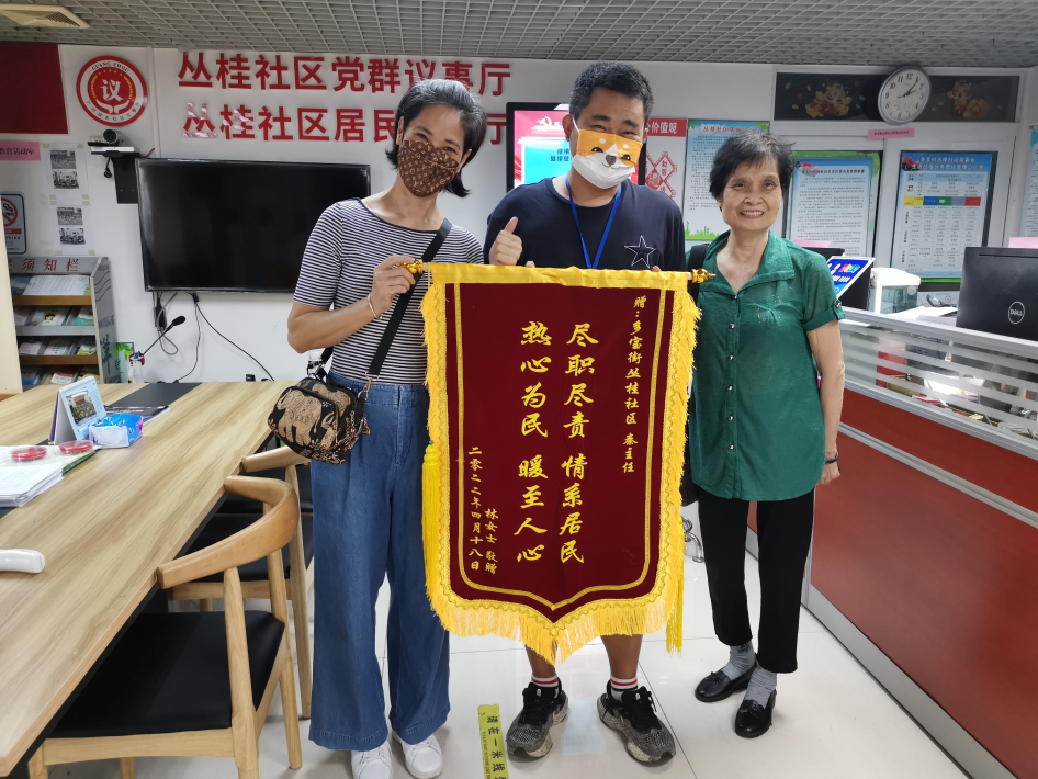 4月26日,两名街坊专门来到多宝街道丛桂社区居委会,将锦旗送至社区党委书记秦毅手中,并表达了对多宝街道及丛桂社区居委会的感谢。
