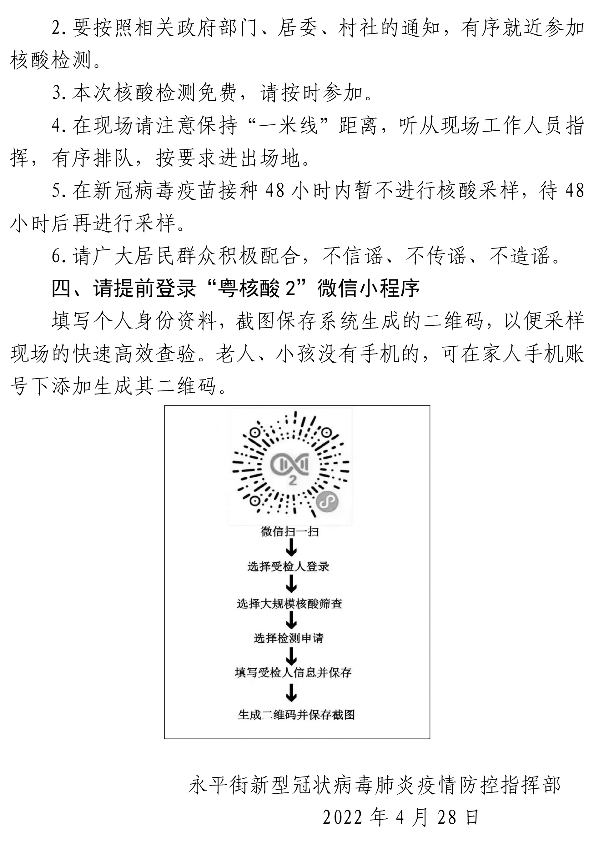 请各位街坊携带智能手机前往核酸检测点,并提前准备好“粤核酸2”小程序的葵花码;