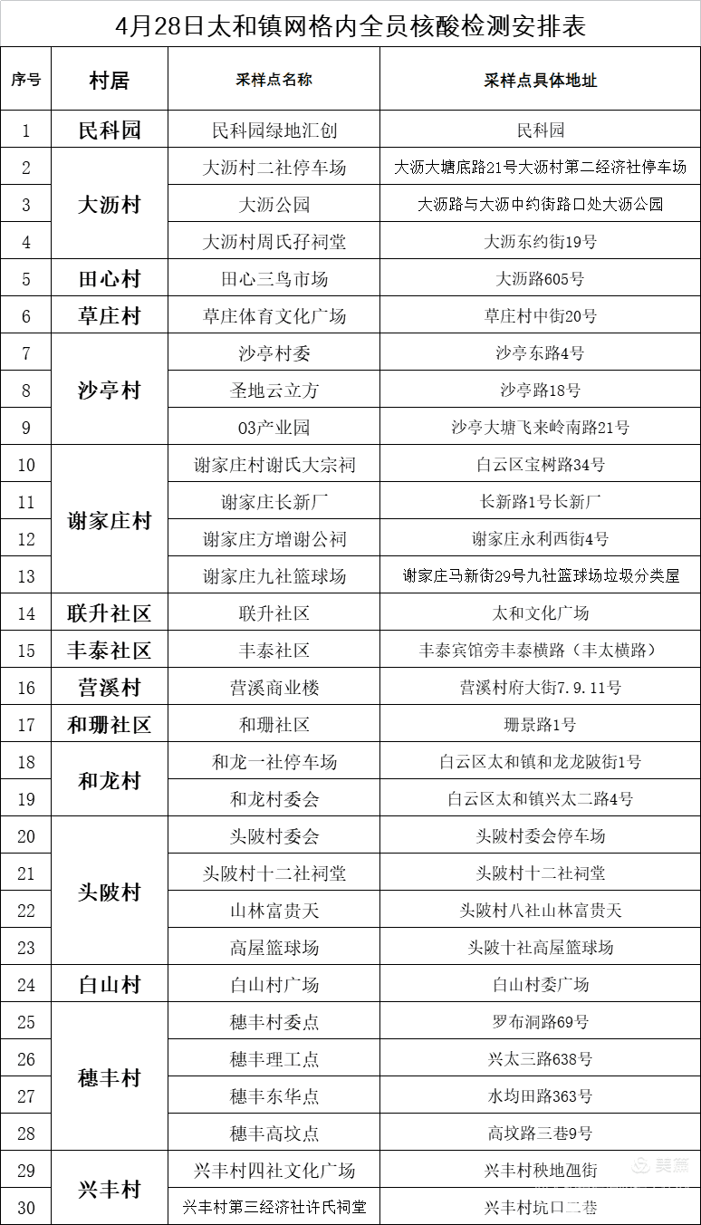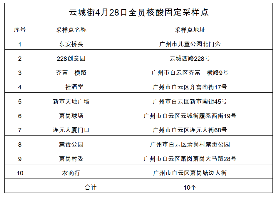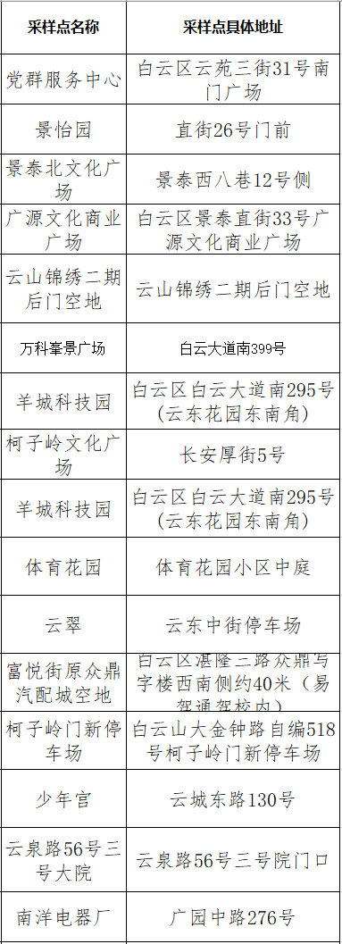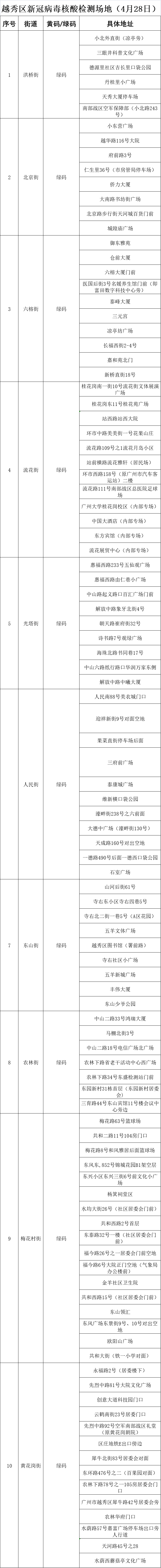 为进一步强化新冠肺炎疫情防控工作,切实保障广大居民群众身体健康和生命安全,按照疫情防控工作安排,4月28日,广州市越秀区、白云区、花都区、海珠区、黄埔区、番禺区、天河区、荔湾区分别发布开展全员核酸检测工作的通知,采样点汇总如下。