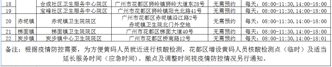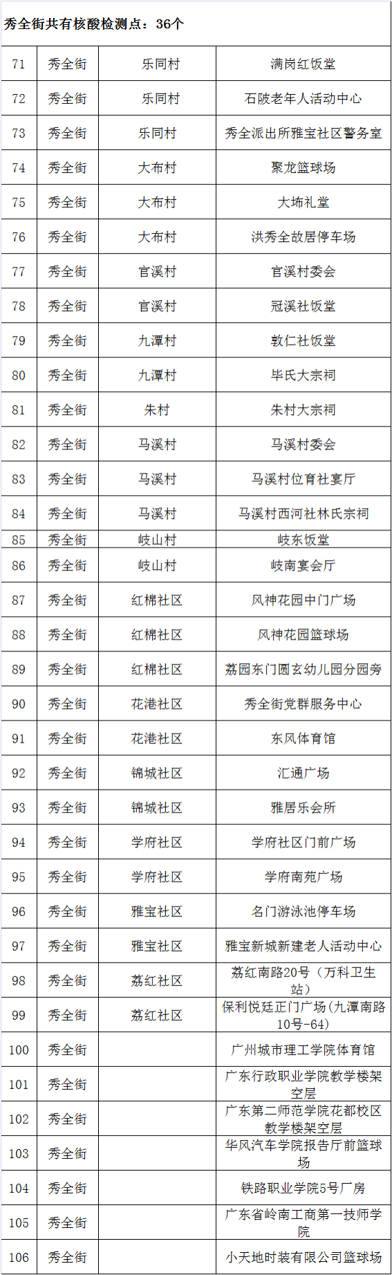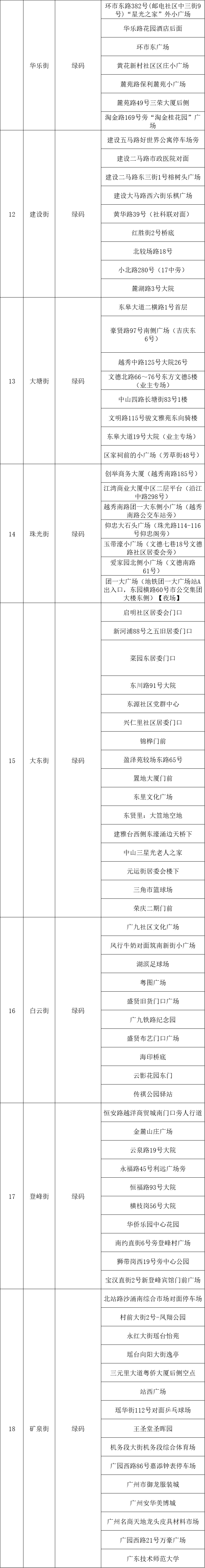 越秀区设置18条街道全员核酸检测场地,涵盖黄码、绿码点等,请市民们尽快前往就近检测点检测。