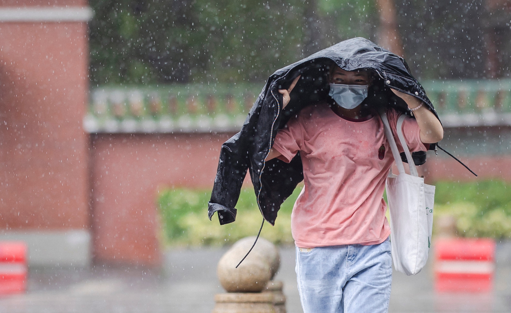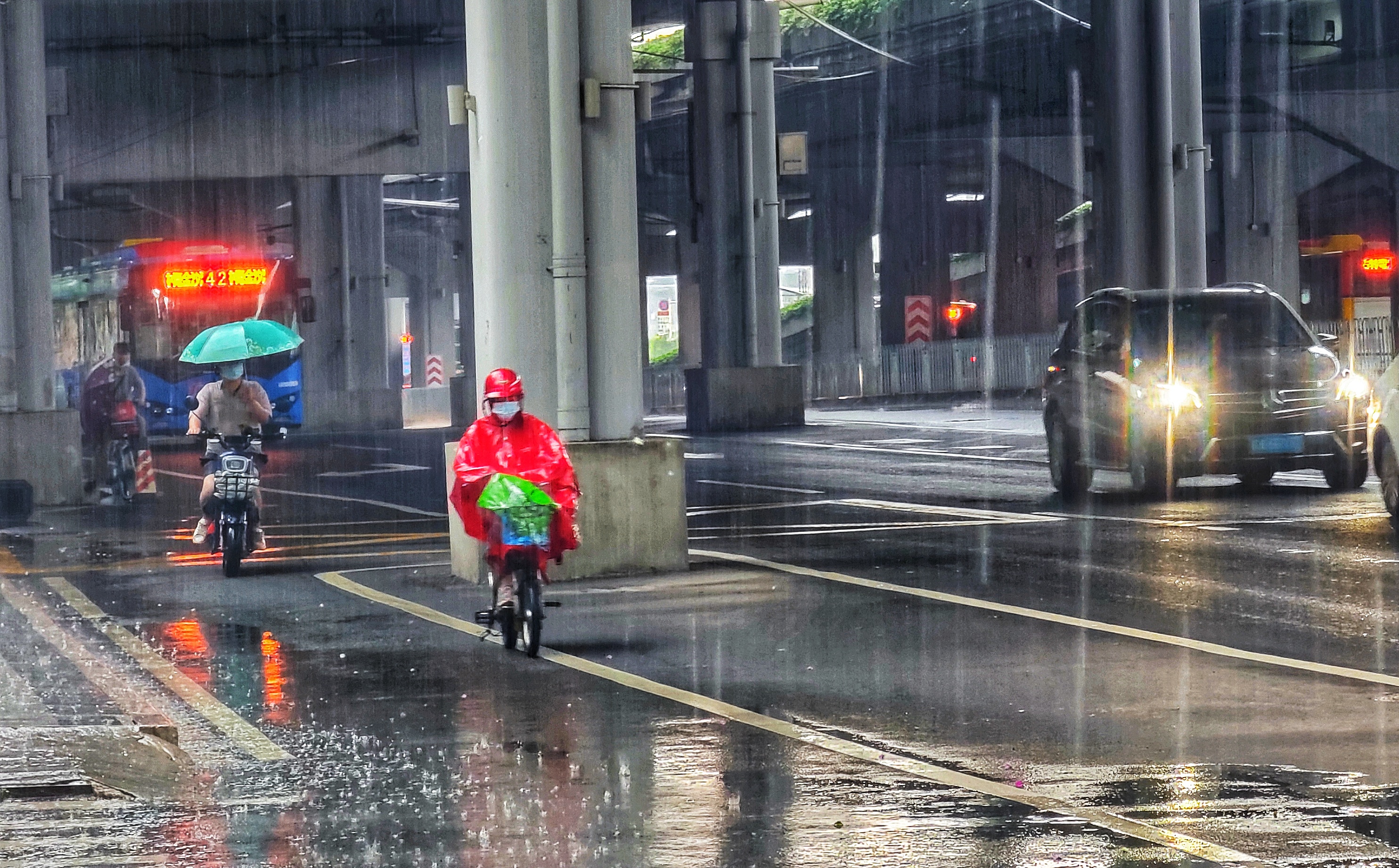 4月28日,广州越秀区环市路一带,雨势较大,路过车辆开启大灯,上班族纷纷找遮蔽处躲雨。