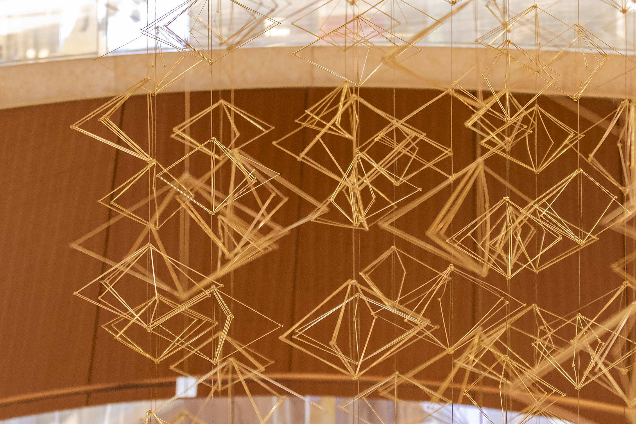 因此,我们在这些作品中看到的并非生硬的、单向的观念传导,而是沉浸式、情境式的沟通和讲述。1972年出生于葡萄牙里斯本的莱诺·安图内斯,以27根形状一致、以黄铜材质打造的优雅线条垂直贯穿商场内的三个椭圆形天井,反射着周围的光线和人影,塑造了空灵的《与她对话》。这件作品将视觉上的轻巧和体积上的规模感结合得非常巧妙,让人们对自身所在的宏大空间有了全新的感受。