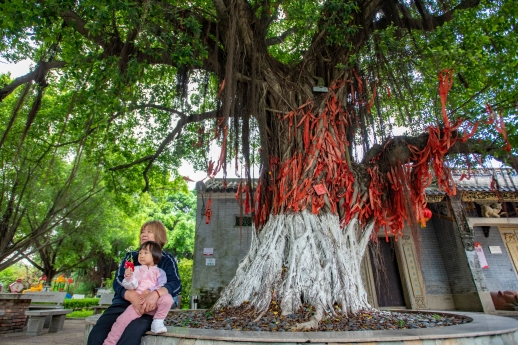 该榕树位于白云区江高镇大田村北帝古庙旁,是当地历史的见证。据老人讲述,该树生长至今已逾130年。百年来,这棵古榕树为人们遮蔽烈日、抵御寒风,村民们也习惯闲暇时在树荫下聊天散步。由于古榕生命力顽强,长势旺盛,成为人们祈求风调雨顺、家庭平安的风水树、许愿树。