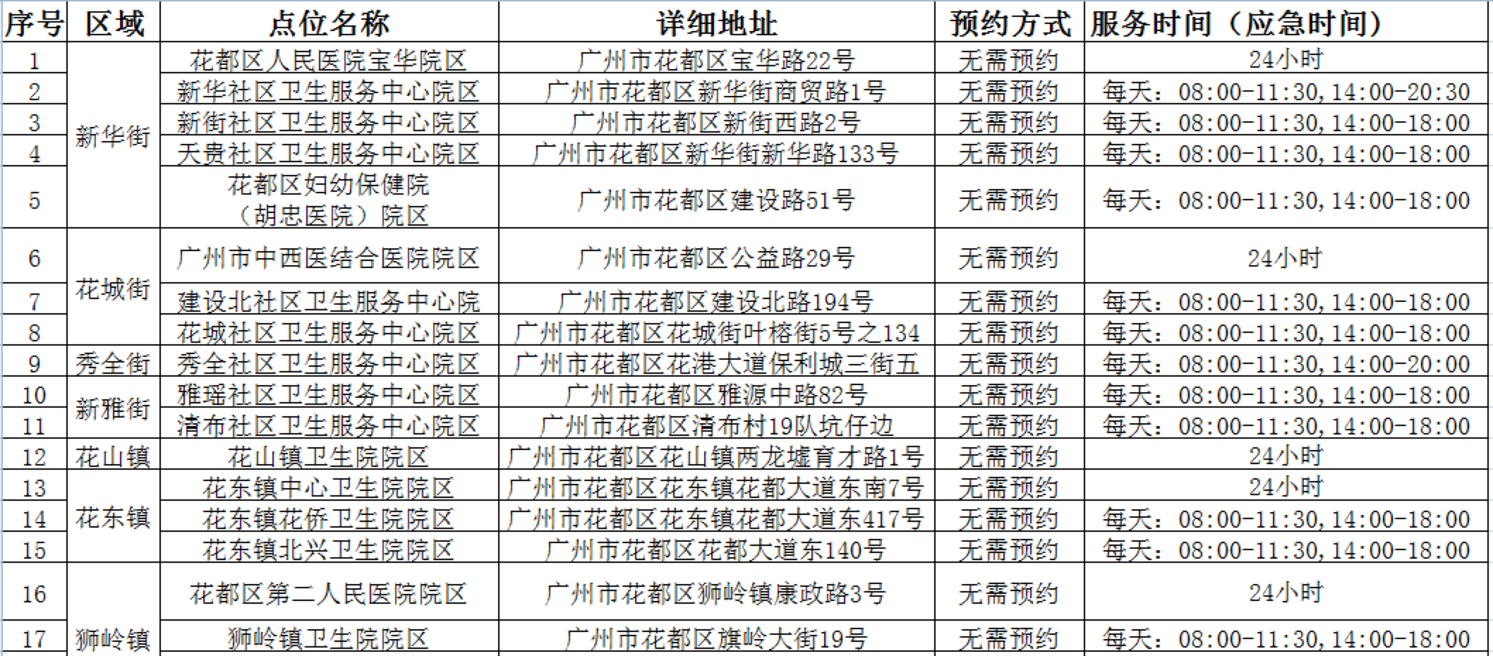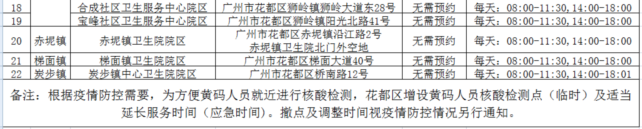 花都区“黄码”人员核酸检测服务点汇总表