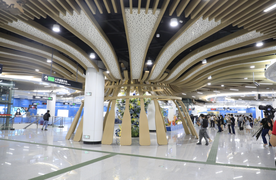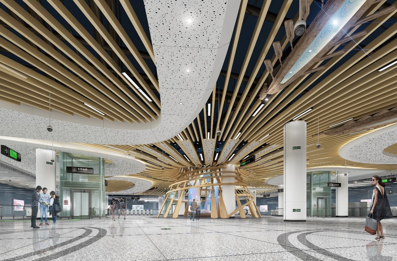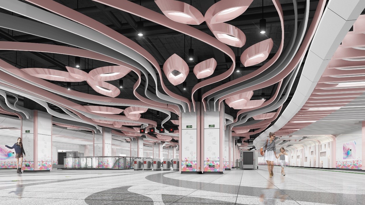 陈村镇素有“中国花卉第一镇”的美誉,又是三字经作者区适子故乡,陈村站设计以“启蒙初地 千年花香”为主题,展示陈村国兰和《三字经》元素,把兰花柔美的曲线和三字经文字运用到公共空间设计中。