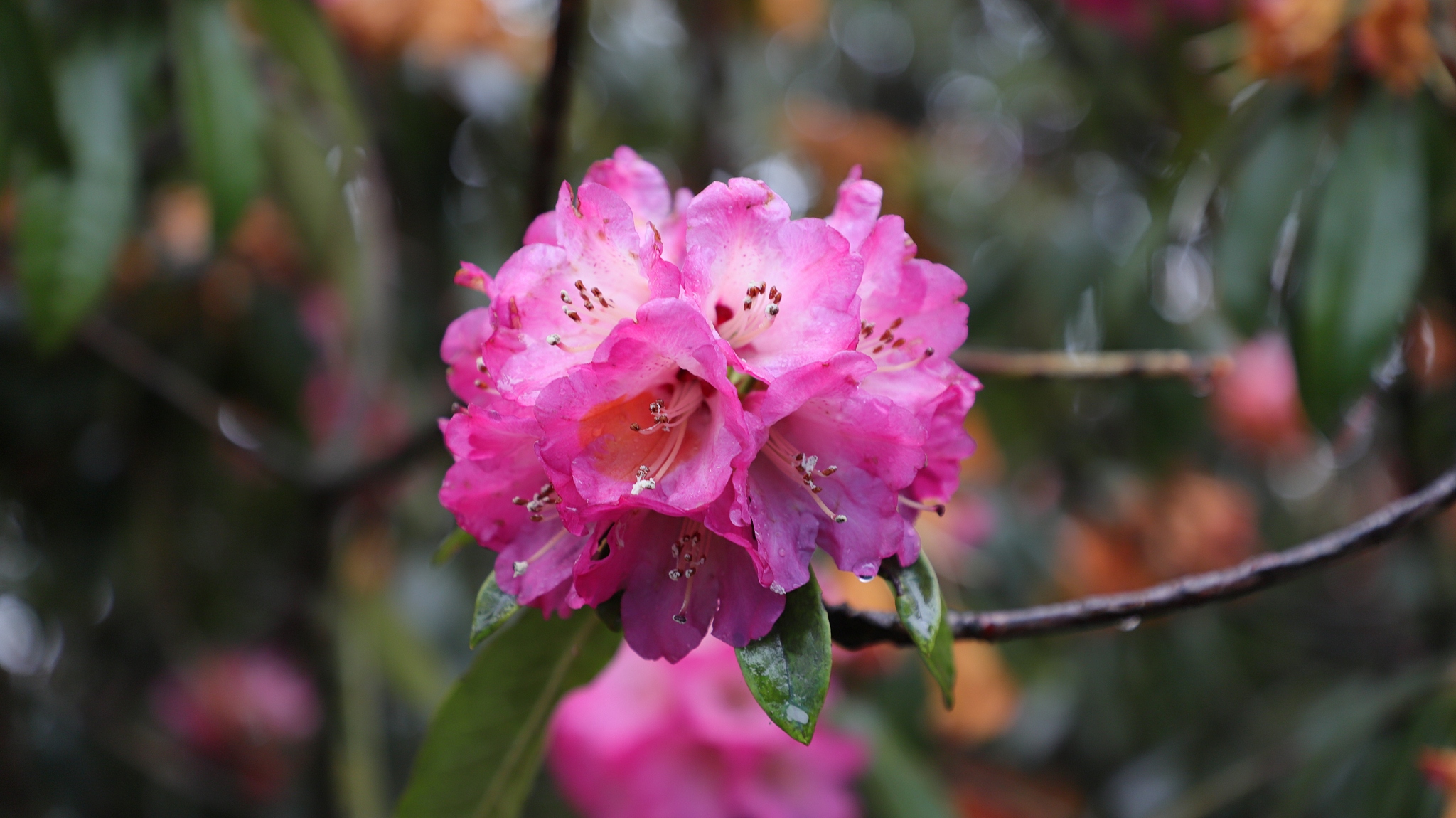 百里杜鹃的美,不仅美在色彩,而且美在丰盈。百里杜鹃大部分杜鹃花都在此间生活了500年以上,年龄最大的甚至已经超过1200岁,多品种的野生杜鹃花和谐共生,形成了“一枝不同花”的罕见景观,高大的足状花茎上最多可开出多达7种颜色各异的花朵,粉色、紫色、白色、黄色、玫红色……野生杜鹃花“齐心协力”,把大片的绿色山林渲染成七彩花海,荟萃成姹紫嫣红的美景。