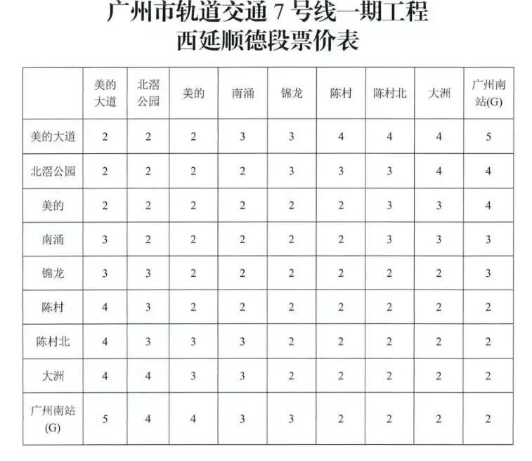 广州市轨道交通7号线一期工程西延顺德段票价表。佛山轨道交通供图