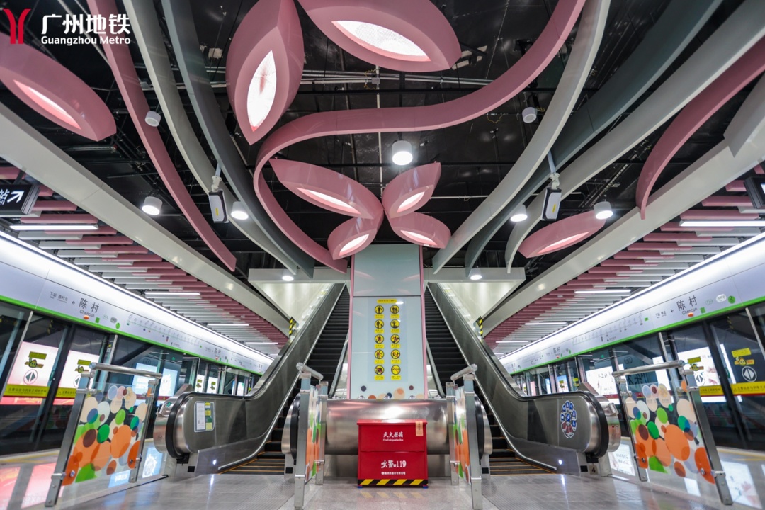 其中陈村站植入了国兰花卉和三字经的元素,把自然植物中柔美的曲线与美丽的色彩运用到公共空间设计中,呈现出传统文化底蕴和自然之美,既有历史文化内容又有时代生活气息。