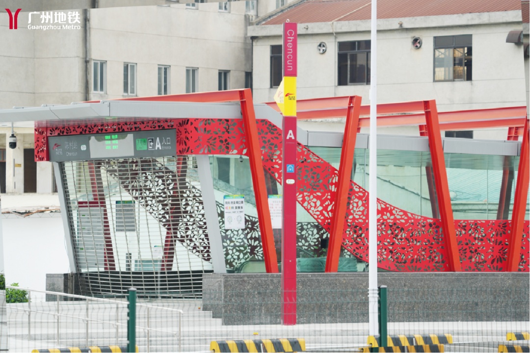 作为连接广州和顺德两地文化交流的纽带,七号线西延段在车站设计上也专门融入了地域文化特色。各站出入口飞顶与既有广佛线的设计不太一样,虽然都是采用红色玻璃盒子和剪纸的风格,但是整体外形设计是龙舟的原型简化提炼,中间红色镂空铝板,既是龙舟的主要船体,也象征一条飘舞的香云纱色带。