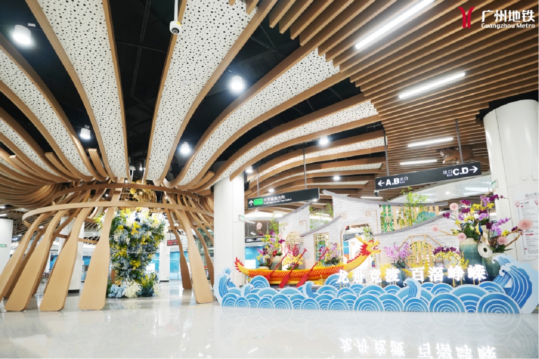 而北滘公园站则以水、龙舟为载体,以“全球视野、百滘峥嵘”展示龙舟竞渡精神传承和发展,寓意北滘人民在龙舟竞赛中奋勇拼搏的精神。