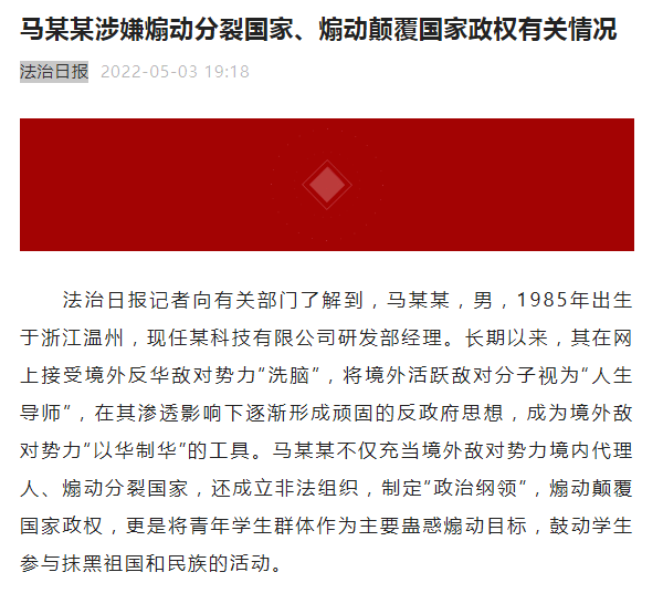 法治日报记者向有关部门了解到,马某某,男,1985年出生于浙江温州,现任某科技有限公司研发部经理。长期以来,其在网上接受境外反华敌对势力“洗脑”,将境外活跃敌对分子视为“人生导师”,在其渗透影响下逐渐形成顽固的反政府思想,成为境外敌对势力“以华制华”的工具。马某某不仅充当境外敌对势力境内代理人、煽动分裂国家,还成立非法组织,制定“政治纲领”,煽动颠覆国家政权,更是将青年学生群体作为主要蛊惑煽动目标,鼓动学生参与抹黑祖国和民族的活动。