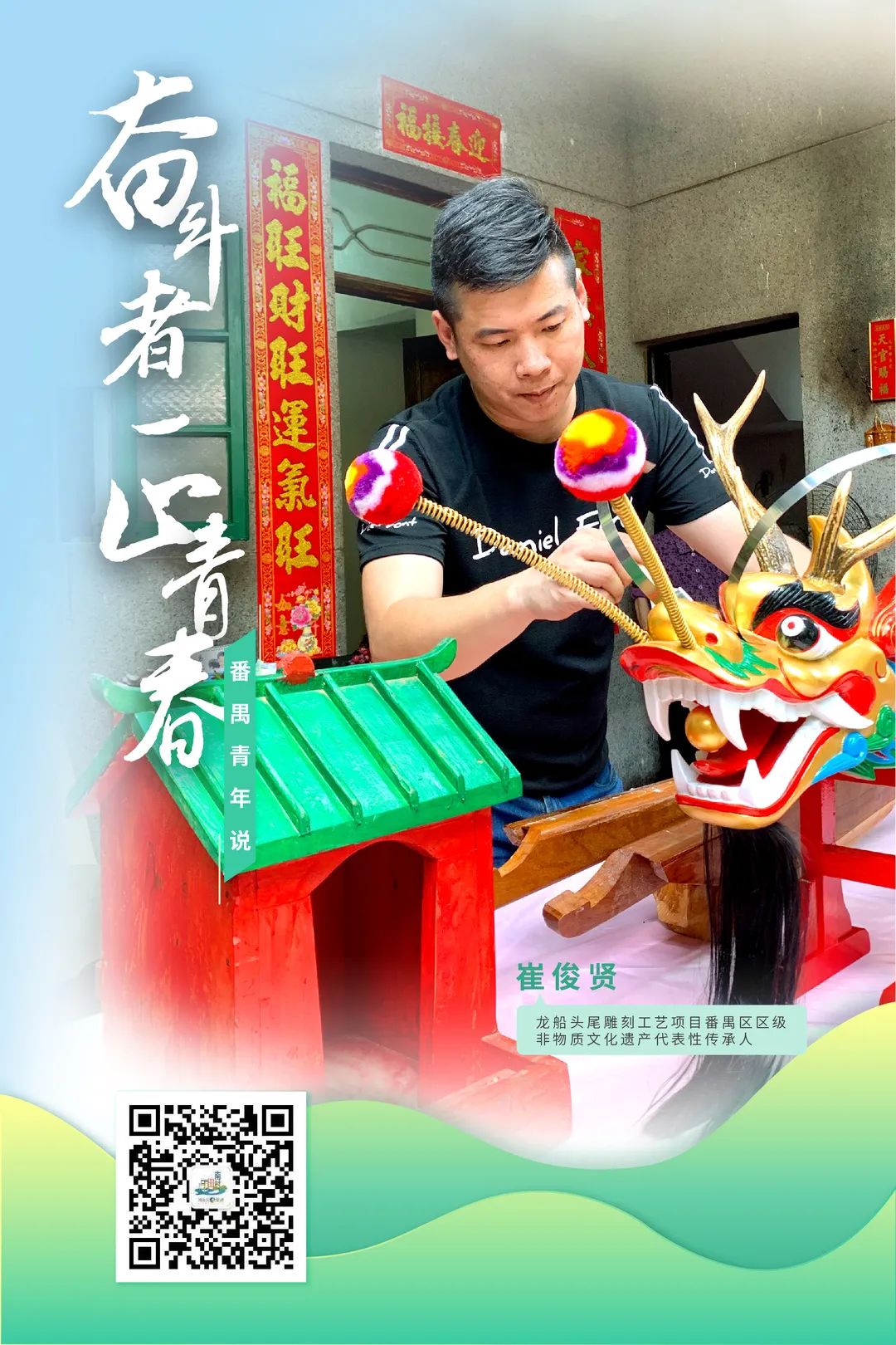 2021年3月,崔俊贤被评为龙船头尾雕刻工艺项目番禺区区级非物质文化遗产代表性传承人。崔俊贤建设了工作室,除了做好龙头龙尾雕刻,也会和学校进行一些互动,让孩子来到工作室参观学习。