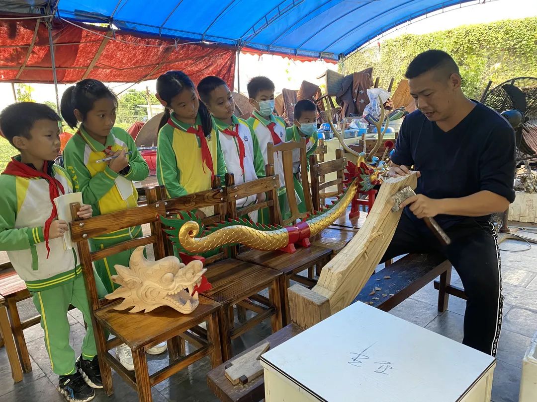 在老师的带领下,同学们参观了催俊贤的工作室。崔俊贤用生动的语言给学生介绍岭南龙舟。他说:“龙舟也有各自的特性,就像人的性格,岭南龙舟面容较为慈祥,而北方龙舟较为好斗。”