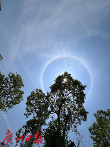 2022年5月4日13时左右,广州天空出现日晕,许多市民拿起手机拍摄。“现在快抬头看太阳,有日晕!”一些微信群里人有提醒,很快朋友圈便有不少日晕奇观照片出现,市民们共同分享下这一神奇美景。