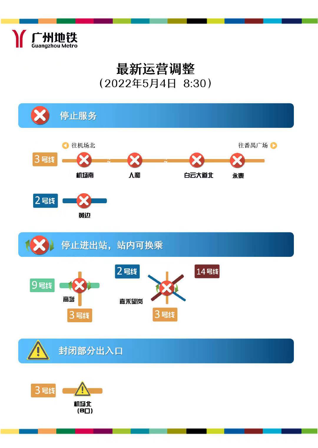 广州地铁通报,接政府部门通知,因疫情防控需要,自5月4日8:30起,三号线永泰站停止对外服务,二、三及十四号线嘉禾望岗站停止进出站服务,仅保留站内换乘功能。