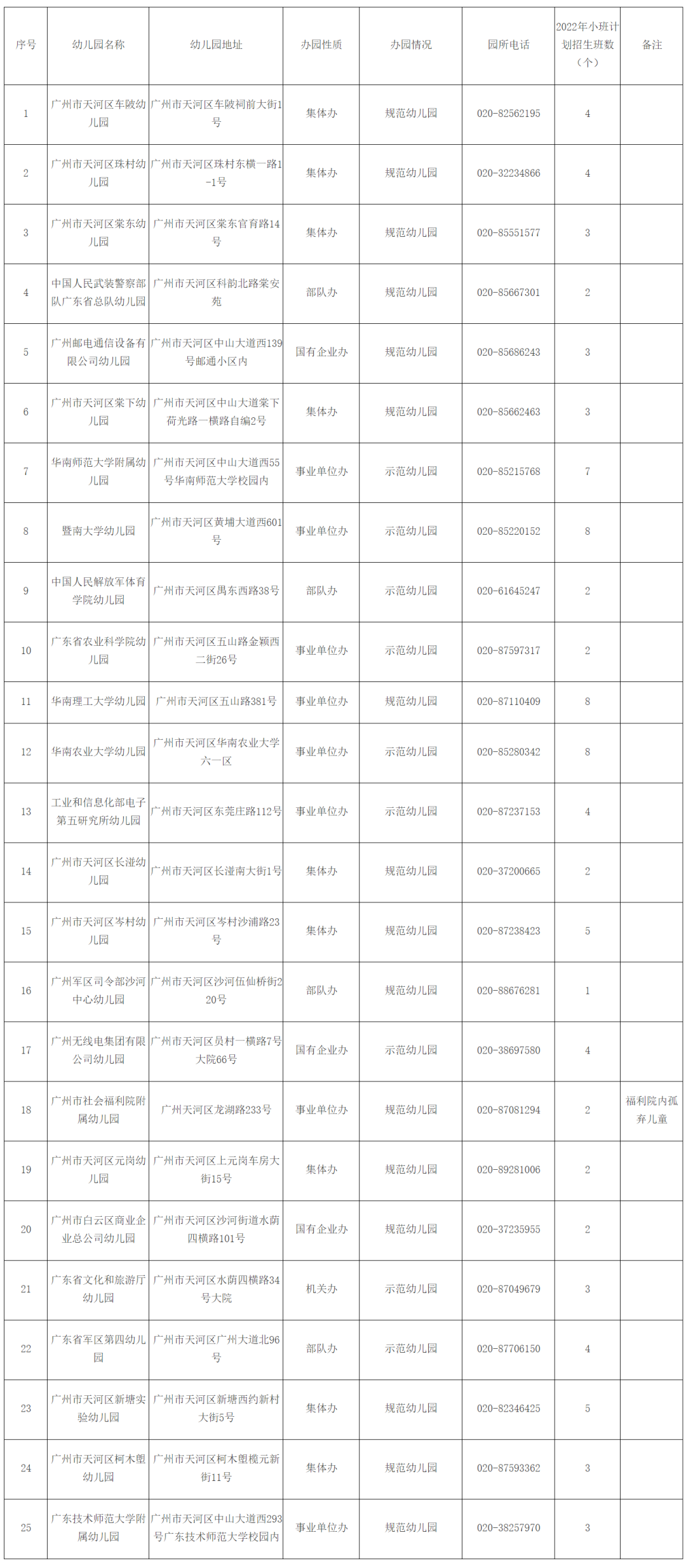 2022年天河区其他部门办幼儿园对外信息表