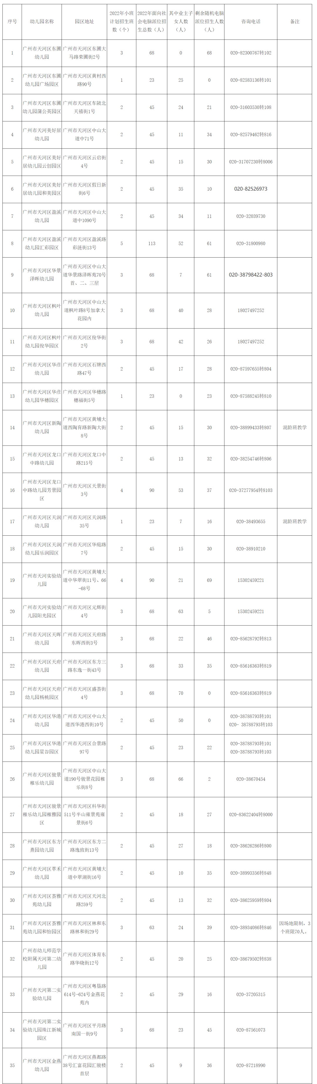 2022年天河区教育部门办幼儿园小班对外电脑派位招生计划
