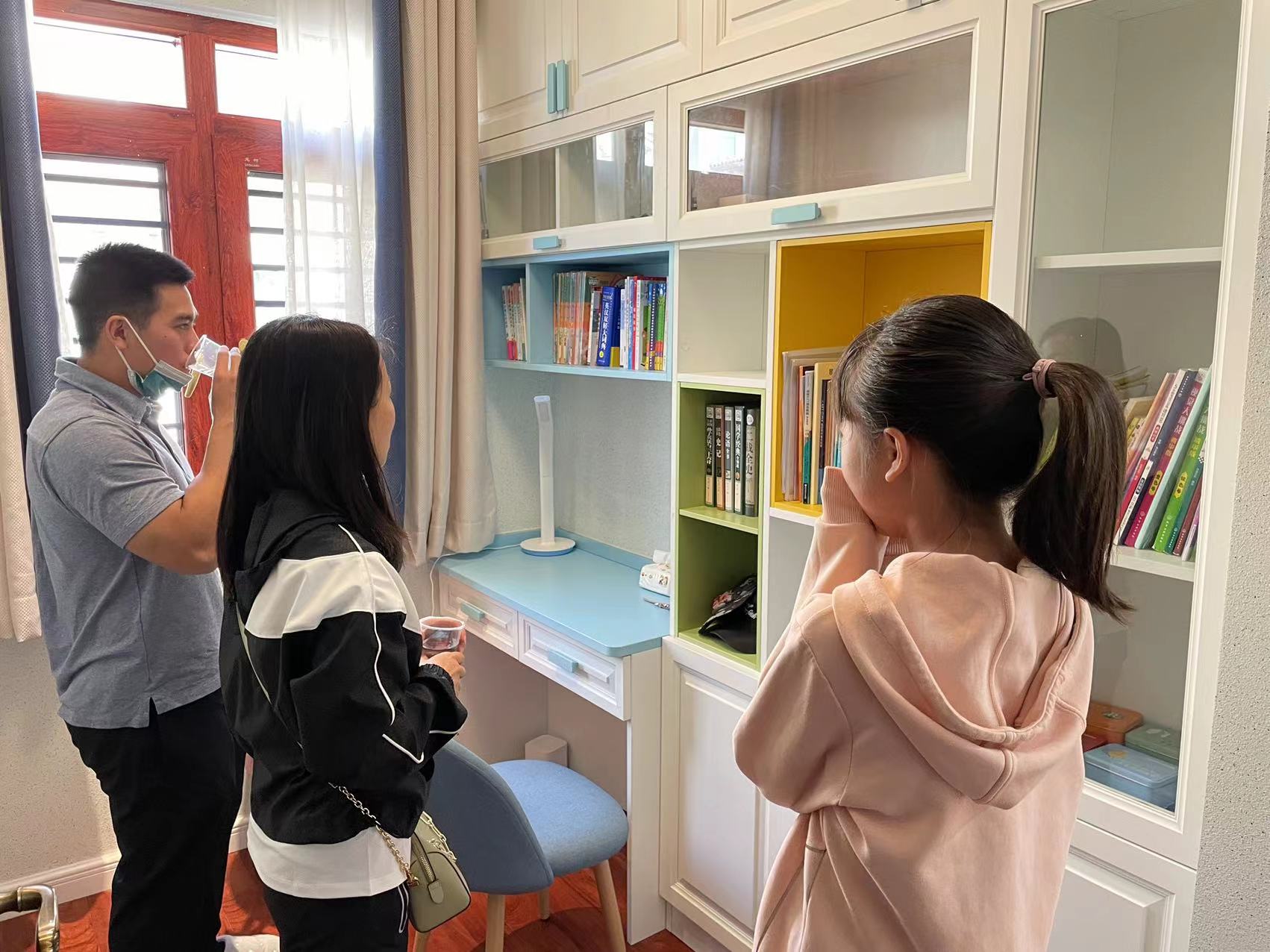 某中学两位老师到学生家中家访,参观其学习环境。家长心声:“那次家校沟通帮了大忙”