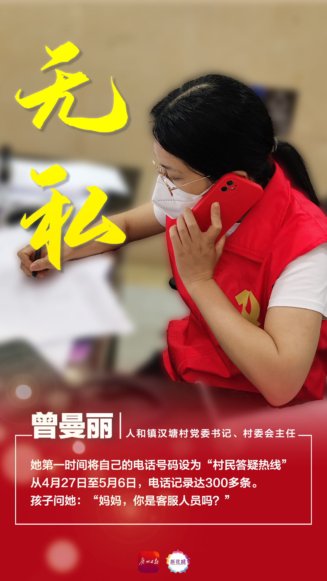 曾曼丽是白云区人和镇汉塘村党委书记、村委会主任,同时是一位二孩妈妈。4月27日,人和镇多地实施管控措施,汉塘村是人和镇面积最大、人口众多的村,汉塘村党委书记曾曼丽第一时间将自己的电话号码公开,作为“村民答疑热线”,让村民有需要就找她。