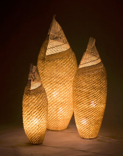 覃教授尝试研发新的编织技术去实现各种新的造型,进而展现新的审美“空间”。他尝试将传统的编织地毯的栽绒技术运用到柳条、藤条等材料之上,改变了经线和纬线的穿插方式,以结构的造型变化催生出新的造型,实现了柳条和竹藤材料的立体造型编织的突破。除了像灯具、茶具这一类的实用物品,近年来,覃大立还创作了一系列大型的室内空间造型,将竹藤材料的特性演绎到新的艺术高度。