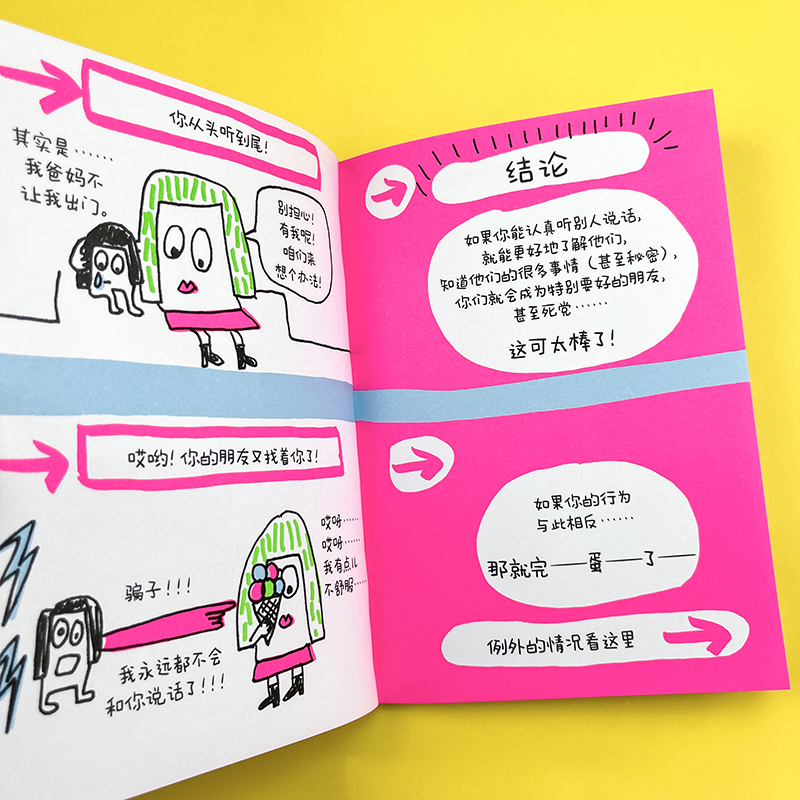 本书分为“沟通的重要性”“沟通是什么”“怎样进行良好的日常沟通”三大部分,每个部分都是从各种生活情境出发,用具体的事例向孩子介绍关于沟通的“干货知识”。在涉及具体的方法时,作者善用正反事例,通过结果的对比让孩子自然而然地理解并学会相应的说话技巧。其中包括了“沟通距离”“沟通时机”“沟通对象”“说话速度”等全方位的实用小技巧,可以解决不同孩子的沟通问题,让他们轻松学会正确地沟通方法。