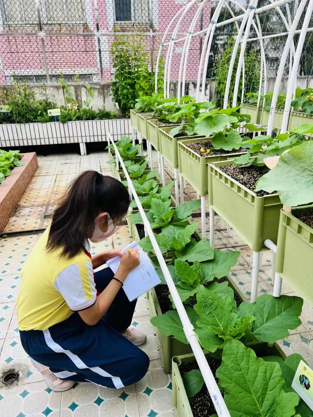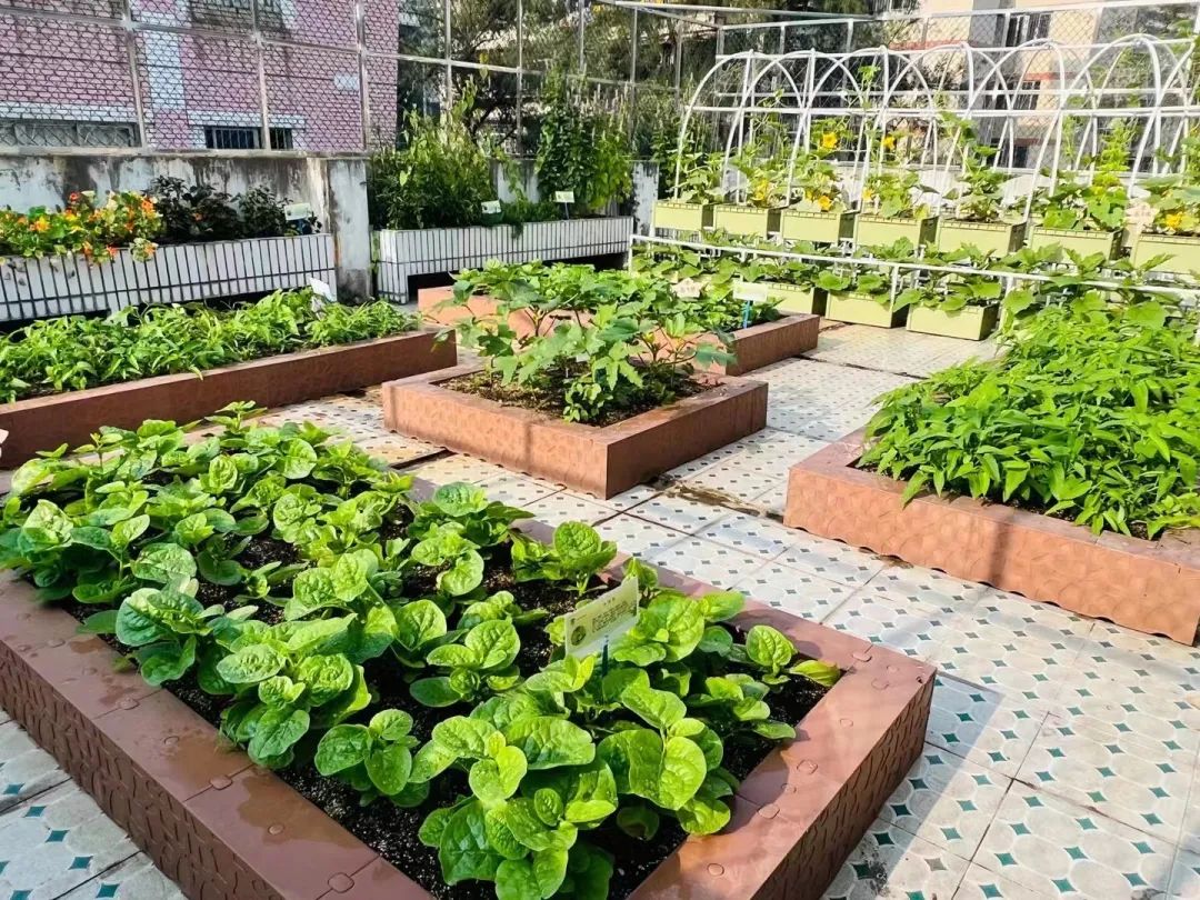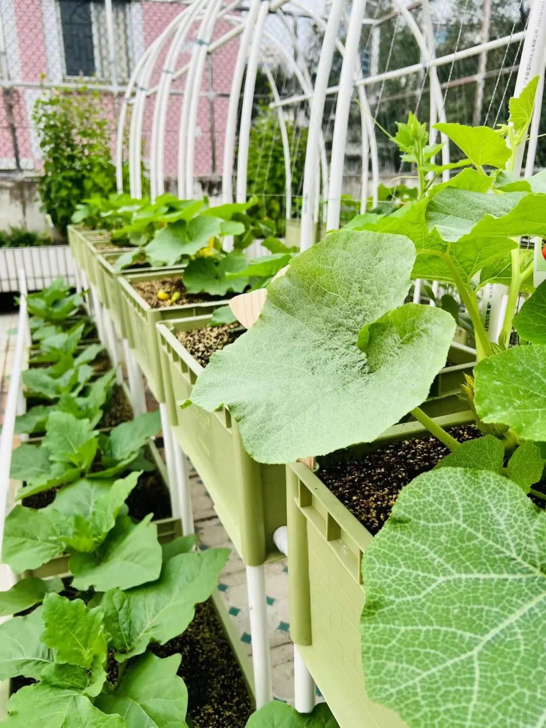 在这个背景下,占地73平方米的黄花天空农场于今年初正式建成,黄晓静说,这个位置其实是教学楼顶楼的一个闲置空间,麻雀虽小,但五脏俱全。“农场东边搭建了拱形种植长廊,种植有攀缘类植物,中间则摆设种植槽,并设有叶菜种植区、瓜果种植区、中草药种植区三大种植区,既实用又美观。”