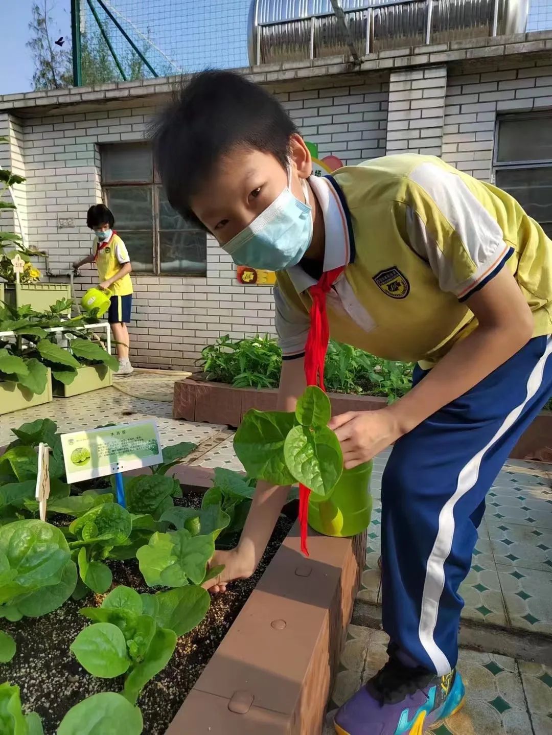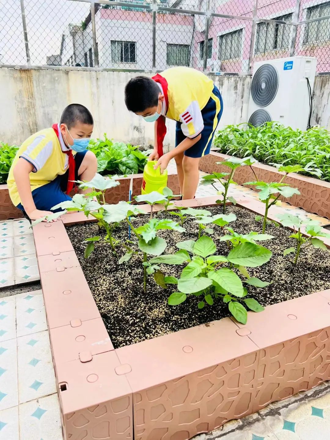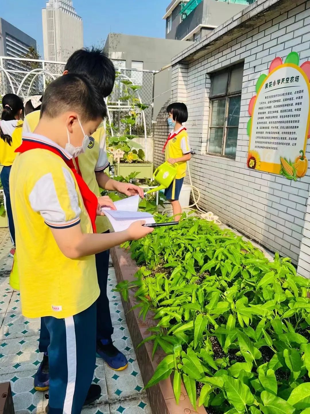 黄晓静介绍,目前农场以分田到班的形式交由五年级的学生作日常管理,“每天上午7点45分至8点05分这段时间,每个班就会派出由2-3人组成的小队上楼浇水、施肥,当然我们也会有兼任劳动老师的班主任和花工在现场协助。”