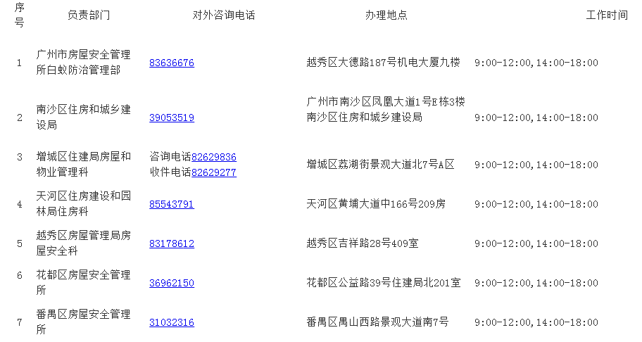 广州市住房和城乡建设局是广州市房屋白蚁防治的行政主管部门,其下属单位广州市房屋安全管理所负责全市房屋白蚁防治管理日常工作。各区房屋行政主管部门负责辖区内房屋白蚁防治管理日常工作。